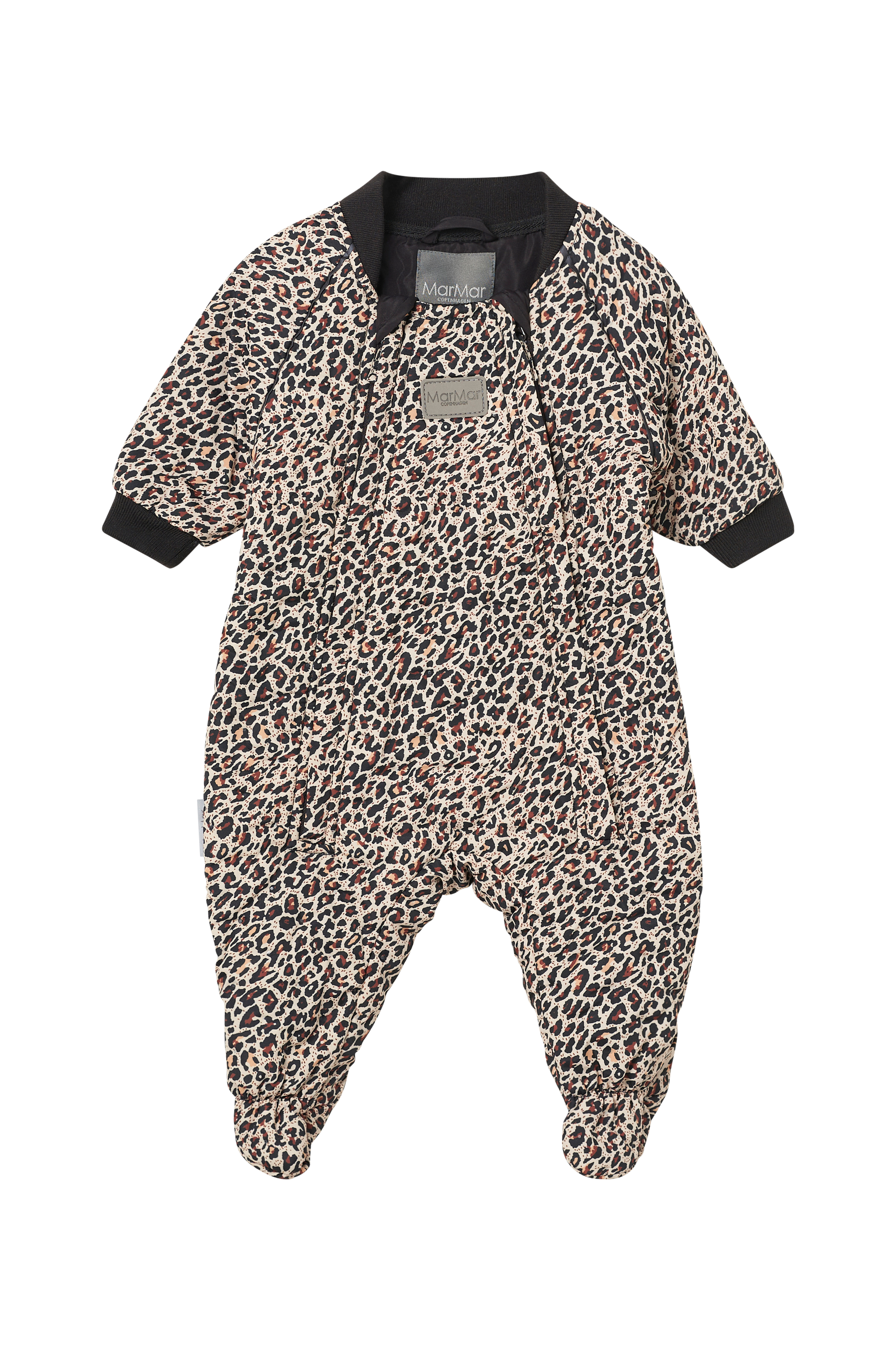 Vatteret, mønstret babydragt med to lynlåse foran. Hel fod. Krave i rib og ribkanter i ærmerne.