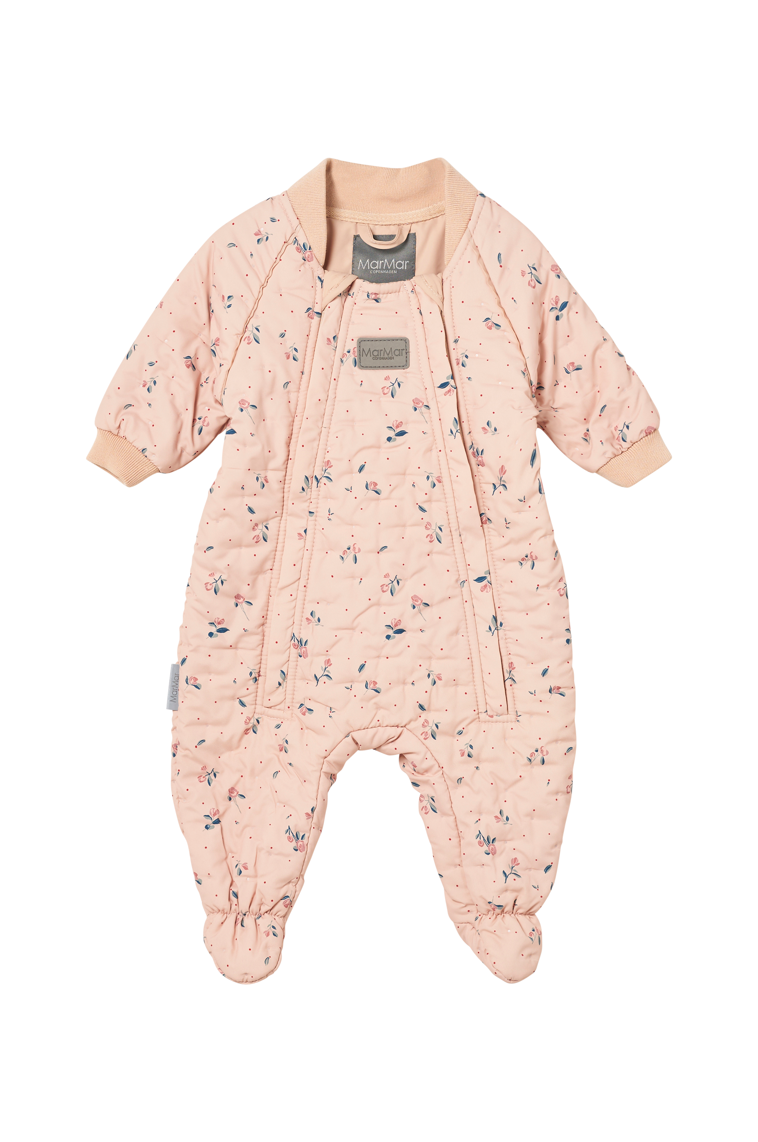 Vatteret, mønstret babydragt med to lynlåse foran. Hel fod. Krave i rib og ribkanter i ærmerne.