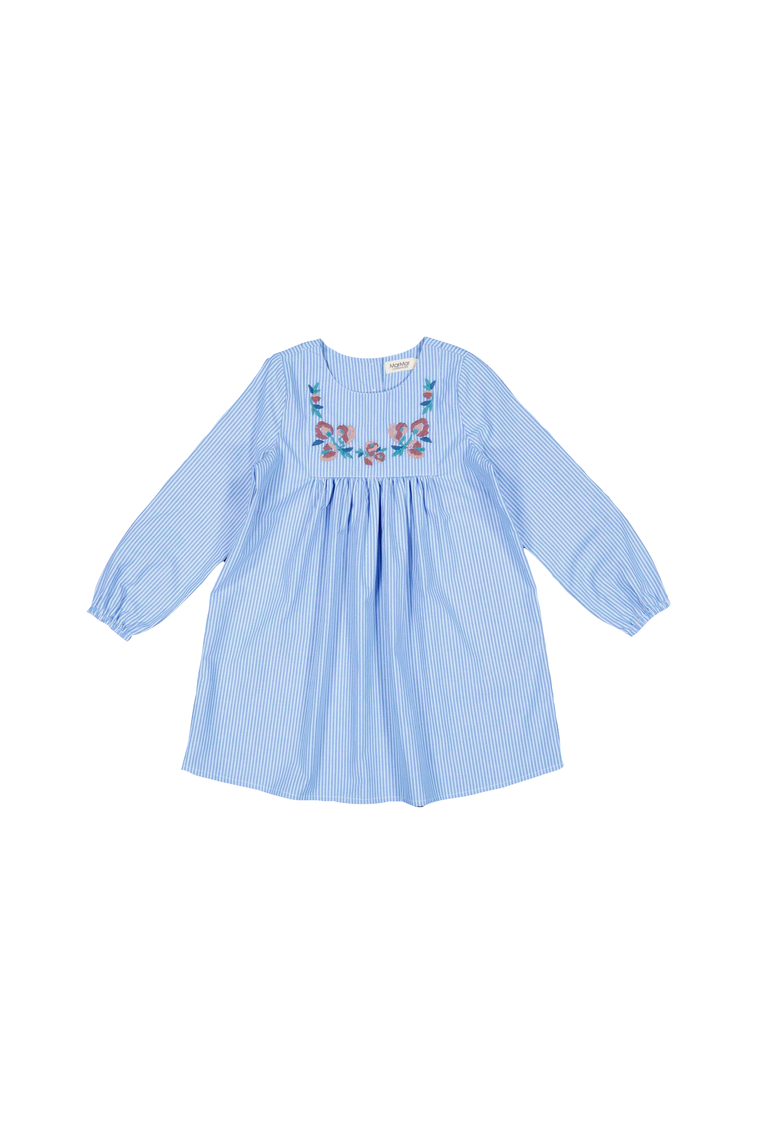 Stribet bomuldskjole med broderede blomster og rynkeeffekter foran. Rund hals med tre knapper bagpå. Elastik i ærmekanten.