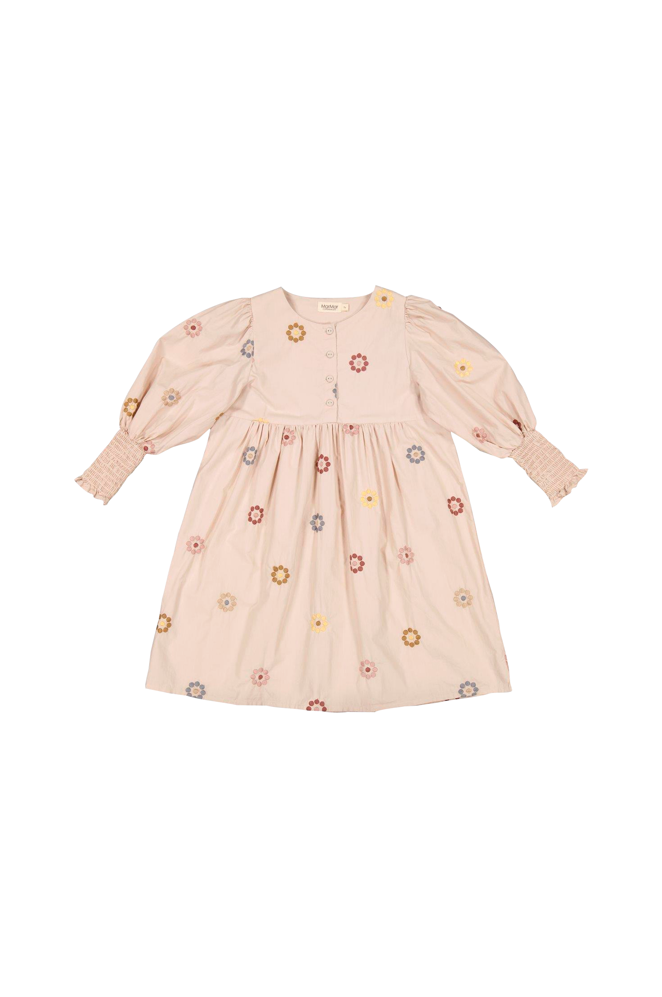 Bomuldskjole med broderet blomstermønster, pufærme og lukning med knapper foran. Rynkeeffekter i taljen og bred smock i ærmekanterne.