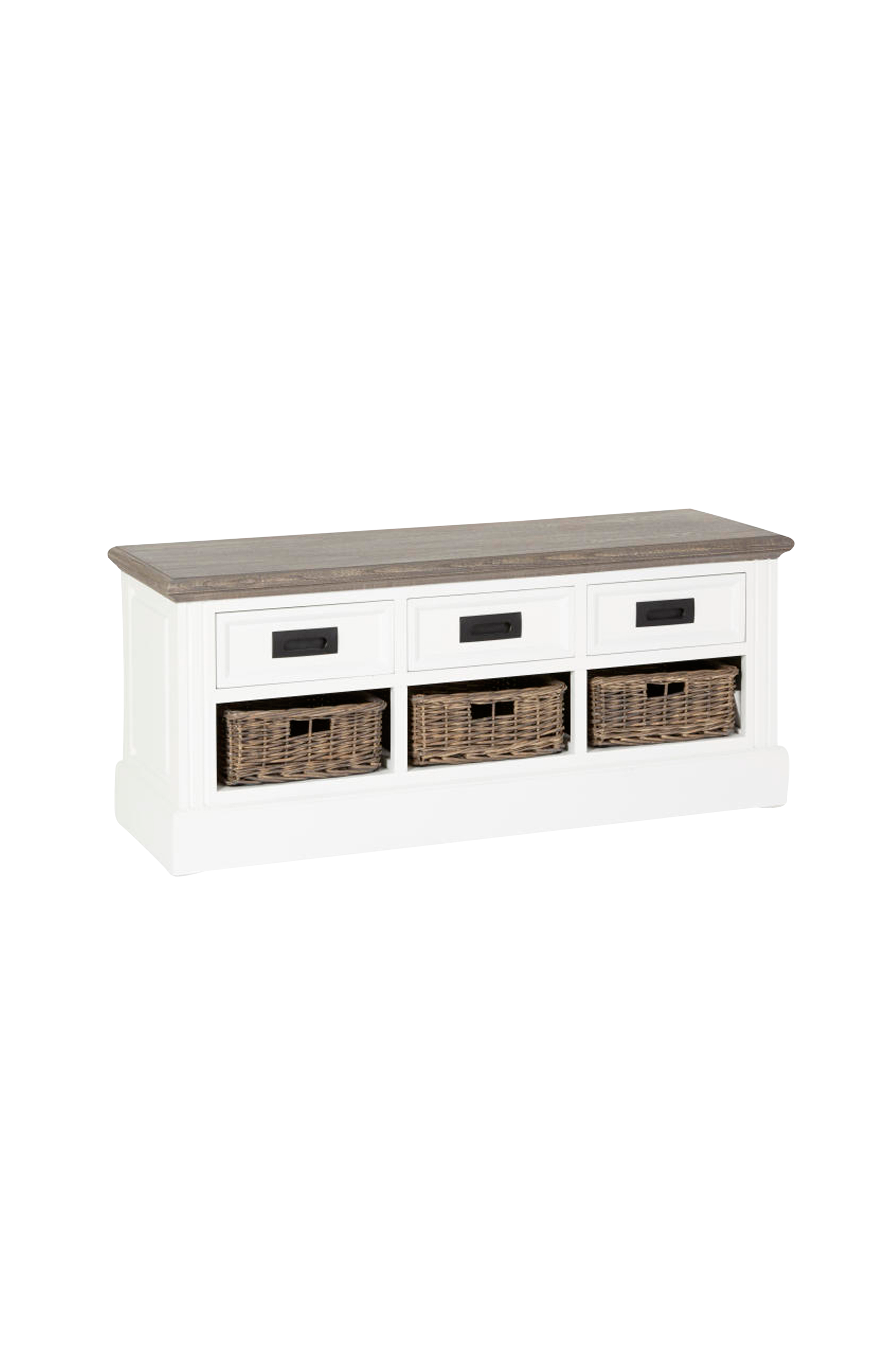 Malou er en smuk antik serie i mange dele. Entrébænken har en utrolig fin antik top. 3 skuffer og rottingkurve medfølger. Leveres samlet.