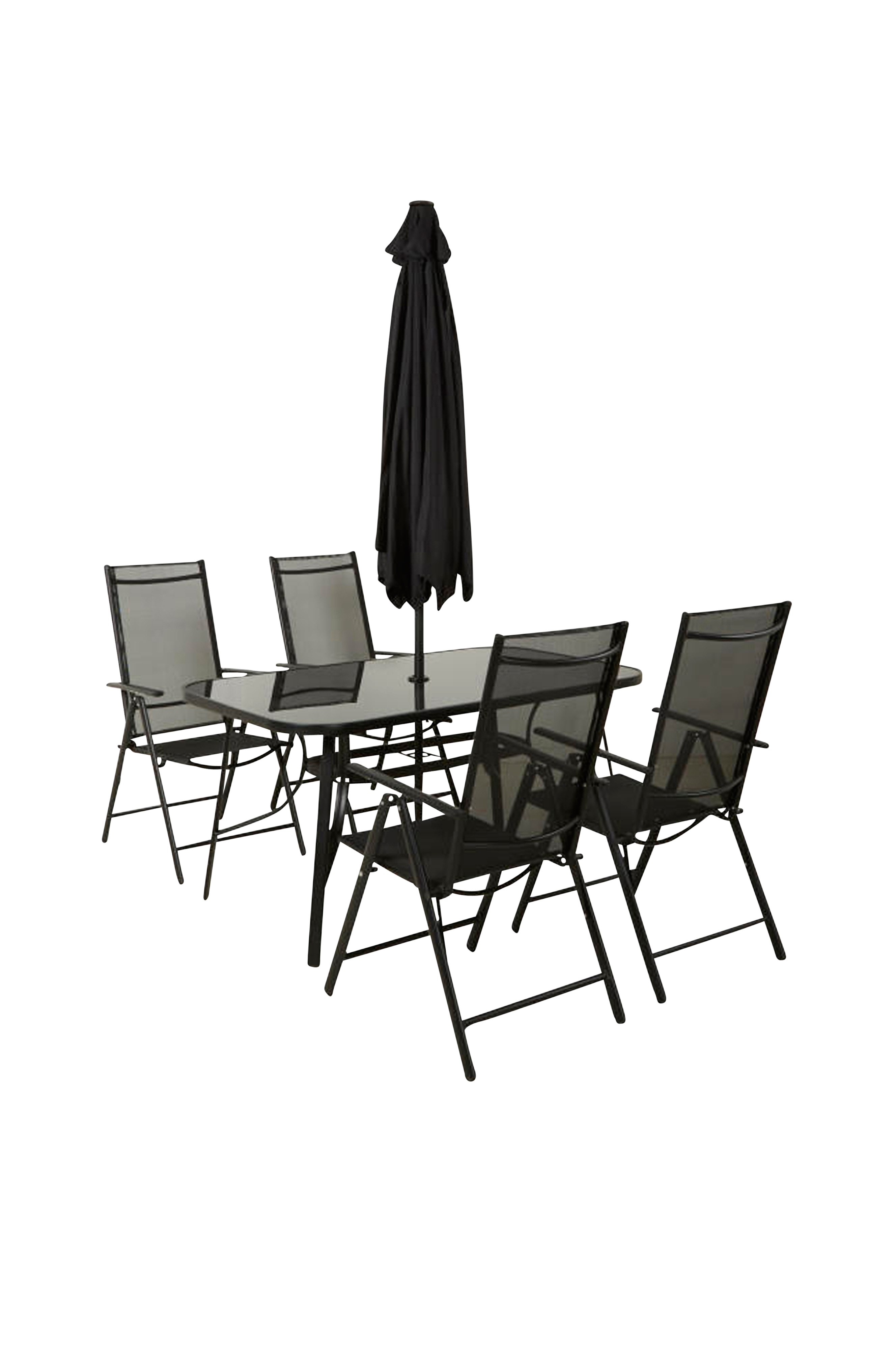 Et helt sæt bestående af bord, 4 stole og en parasol.
