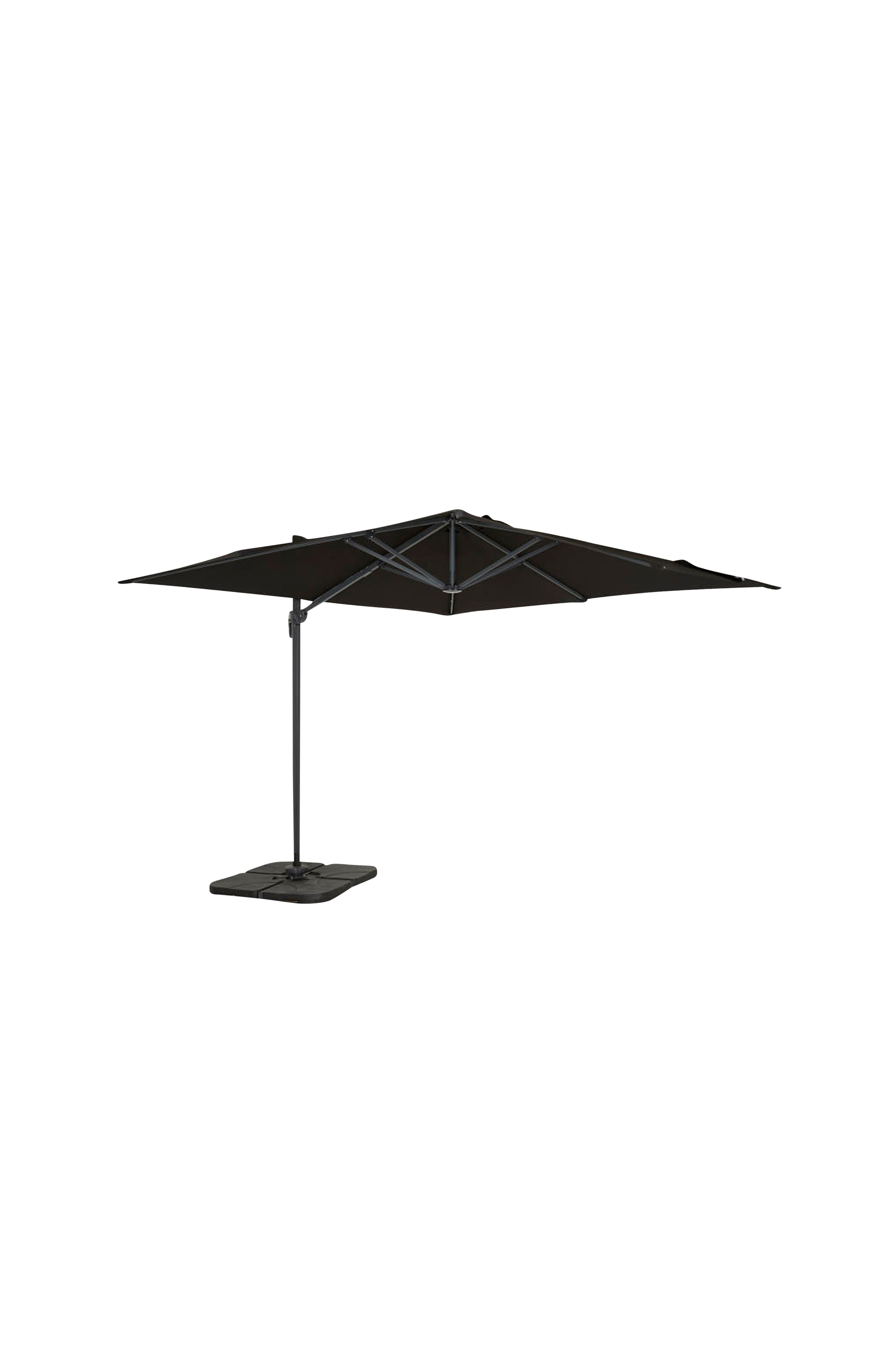 Hængeparasol med pulverlakeret aluminiumsstolpe og aluminiumsribber. Med luftventil og håndsving til at åbne og lukke parasollen. Med 360 graders justerbarhed. Fremstillet med dug i sortfarvet 240 g polyester med PA-belægning. Parasollen leveres med X-fod men uden plader.