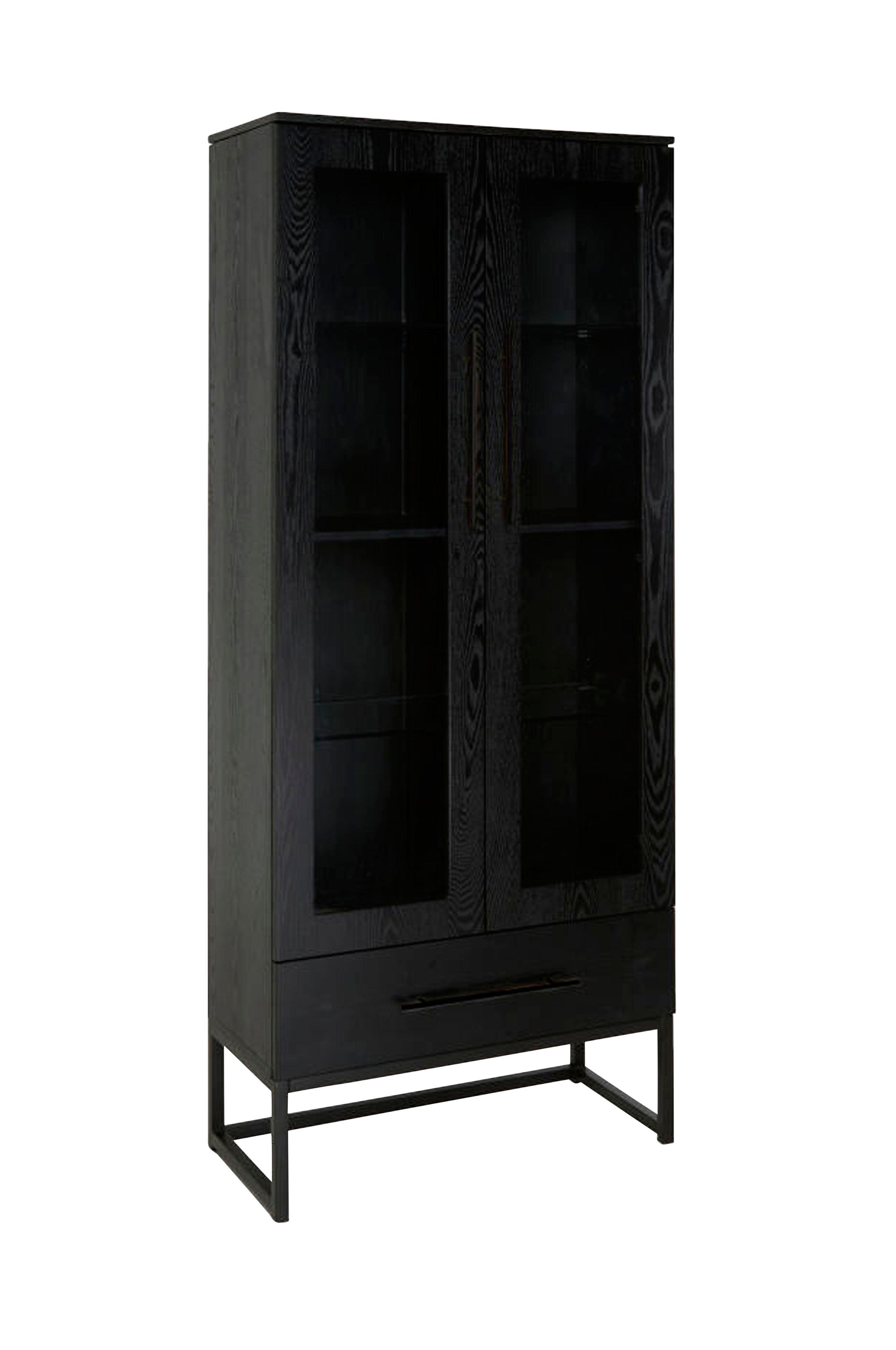 Stilrent vitrineskab i sort askfinér på MDF og metalstativ med glaslåger. Med skuffer og softclose-funktion.