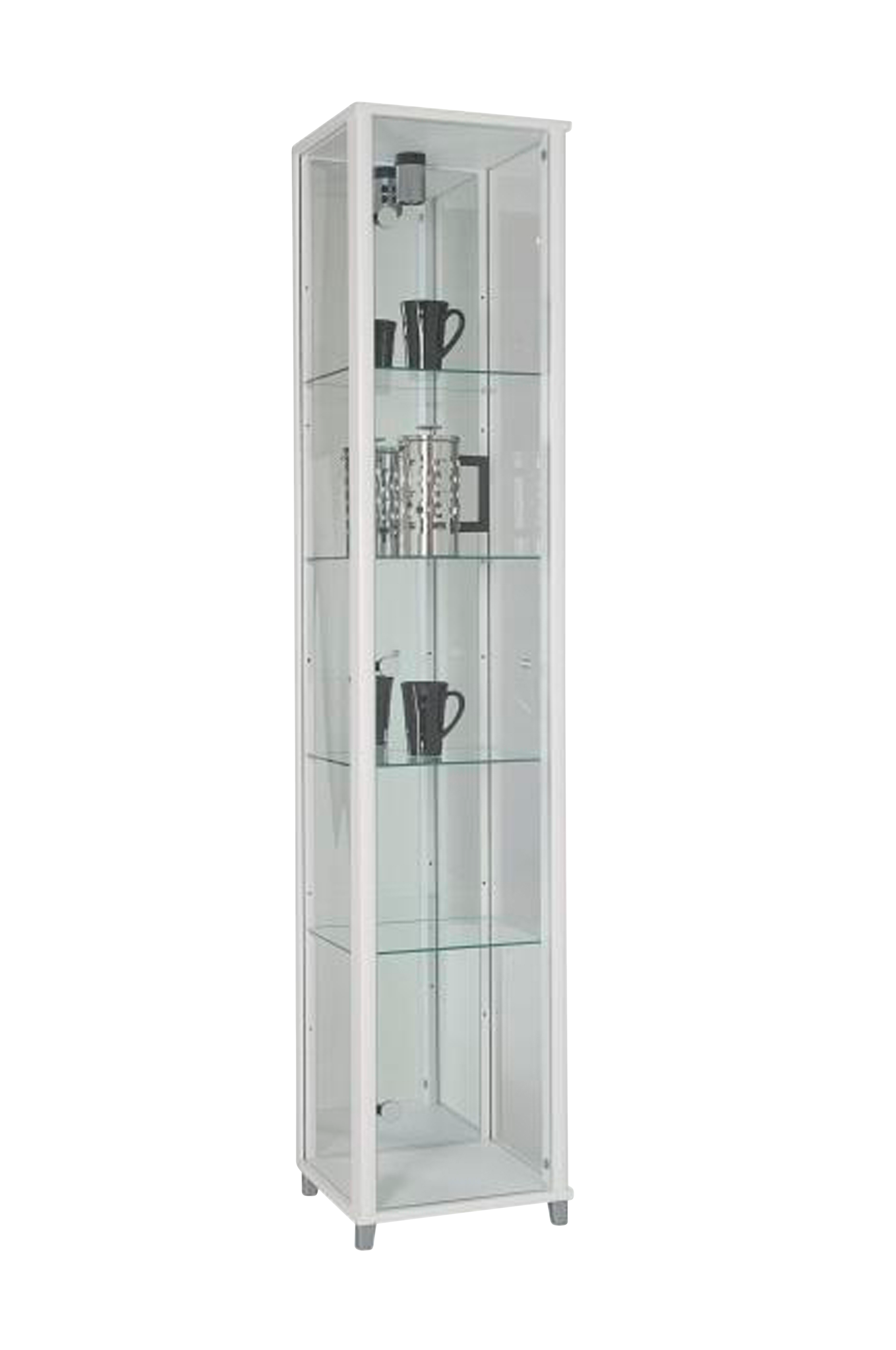 Optima Bright vitrineskab med belysning. Af MDF og glas. Glashylderne tåler en belastning på maks. 5 kg pr. hylde. Du kan fordele hylderne på forskellige måder. Enten 23 eller 39 cm mellem hylderne. Ledningen er 3 m. Kan monteres uden ben, men der bør sættes beskyttende filt/knopper i bunden for at forhindre ridser i gulvet. Kontakt samt LED-pærer i henhold til europæiske standarder. Leveres usamlet.
