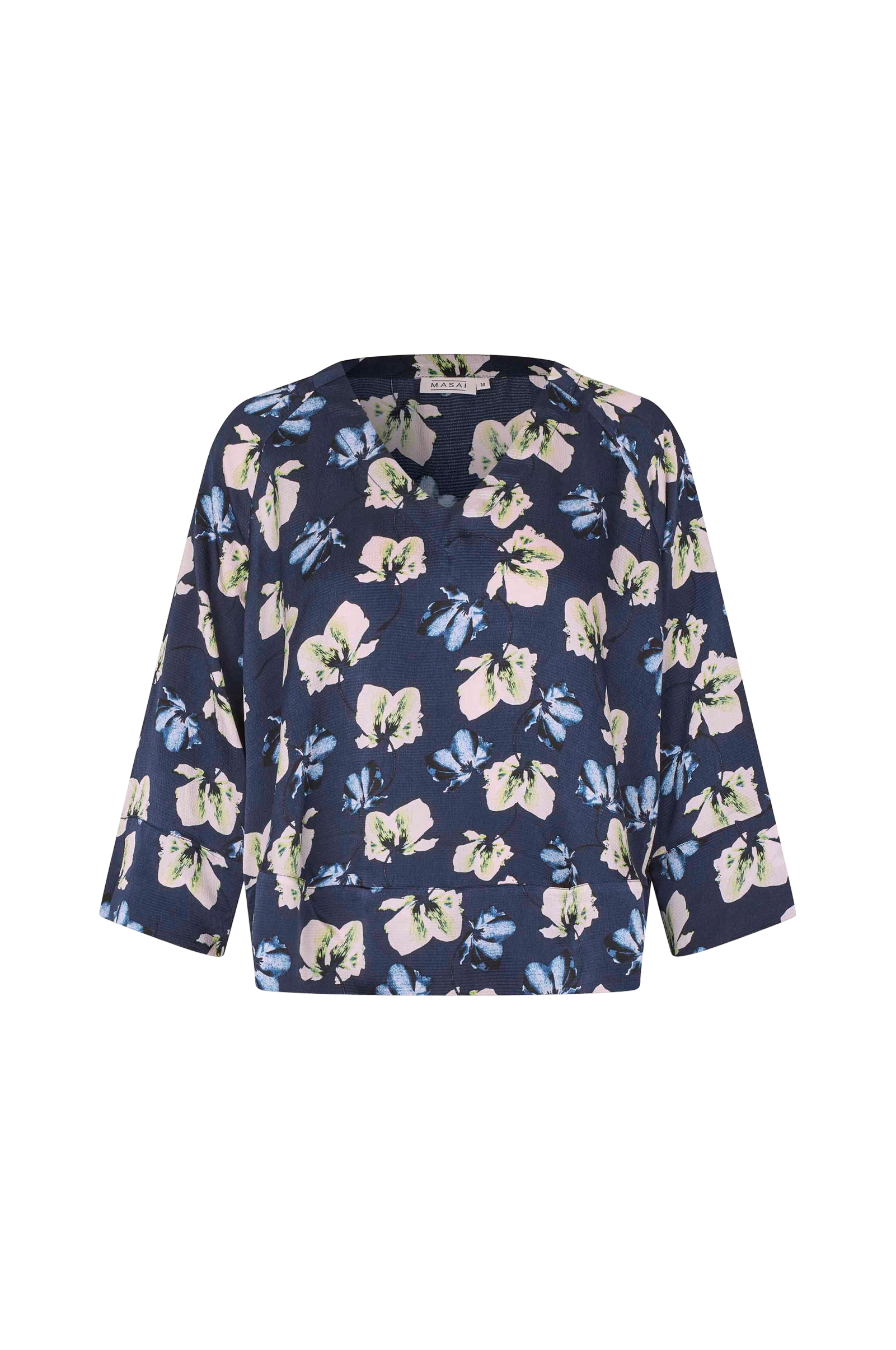 • Bluse i let struktureret, skinnende materiale• V-formet halsudskæring• 3/4 lange ærmer• Afrundet søm• Slids ved ærmeafslutningerne og nede i siderne