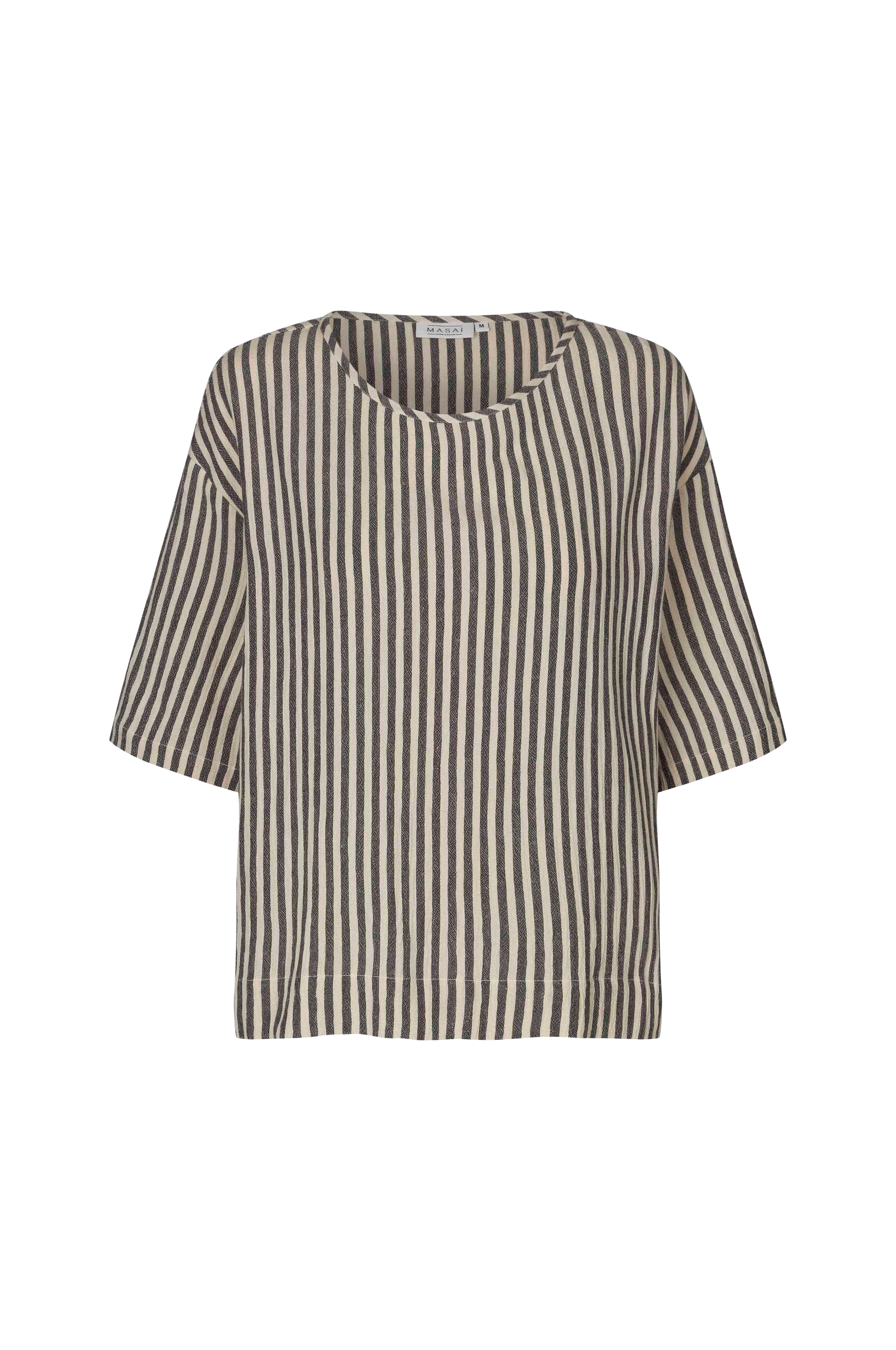 • Stribet bluse i viskoseblanding med let struktur• Rund halsudskæring• Kort ærme• Lige, afslappet pasform• Store størrelser