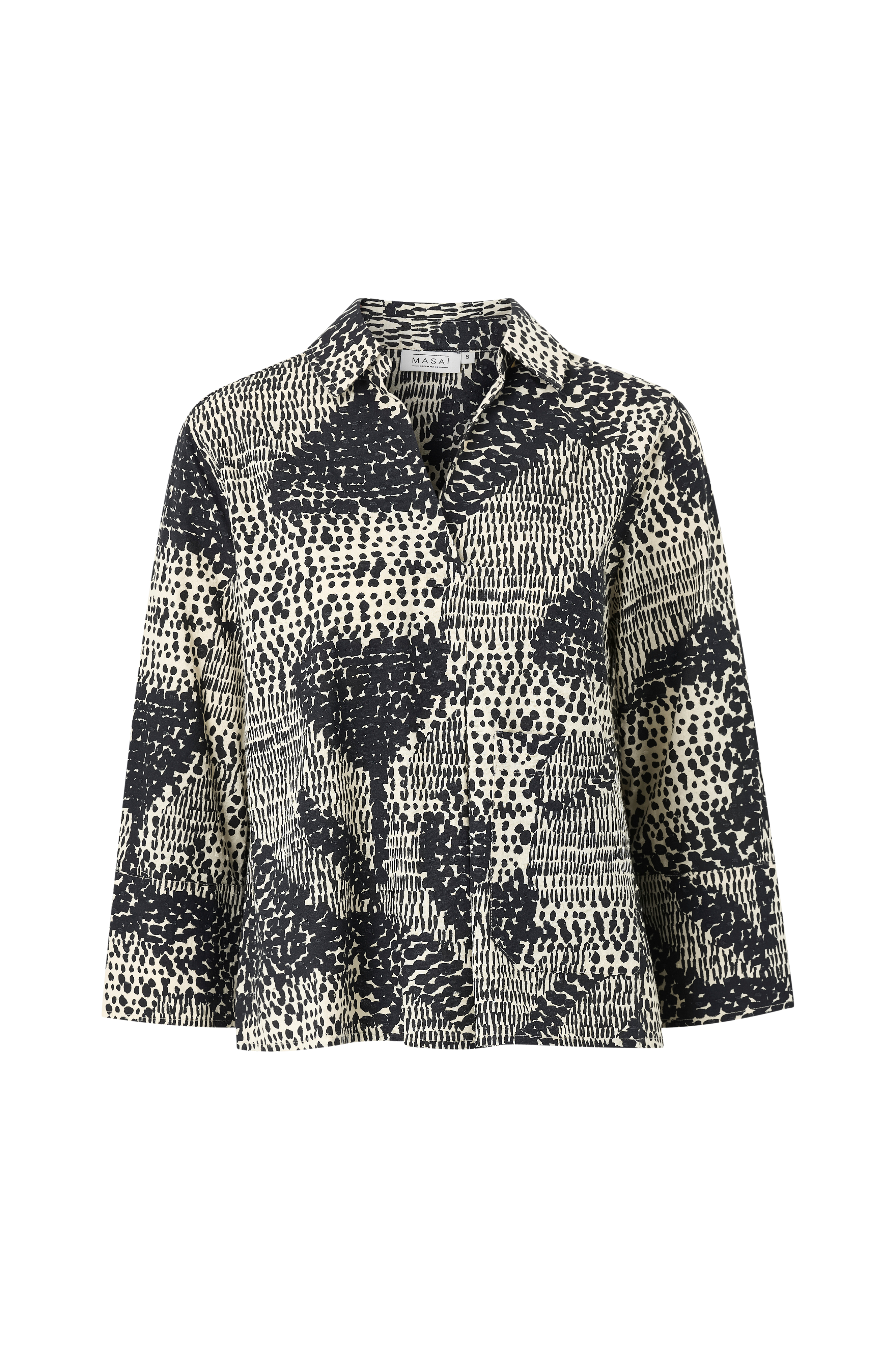 • Bluse med v-formet halsudskæring og krave• Strukturprikker hele vejen rundt• 3/4 lange ærmer med manchetter• En forlomme