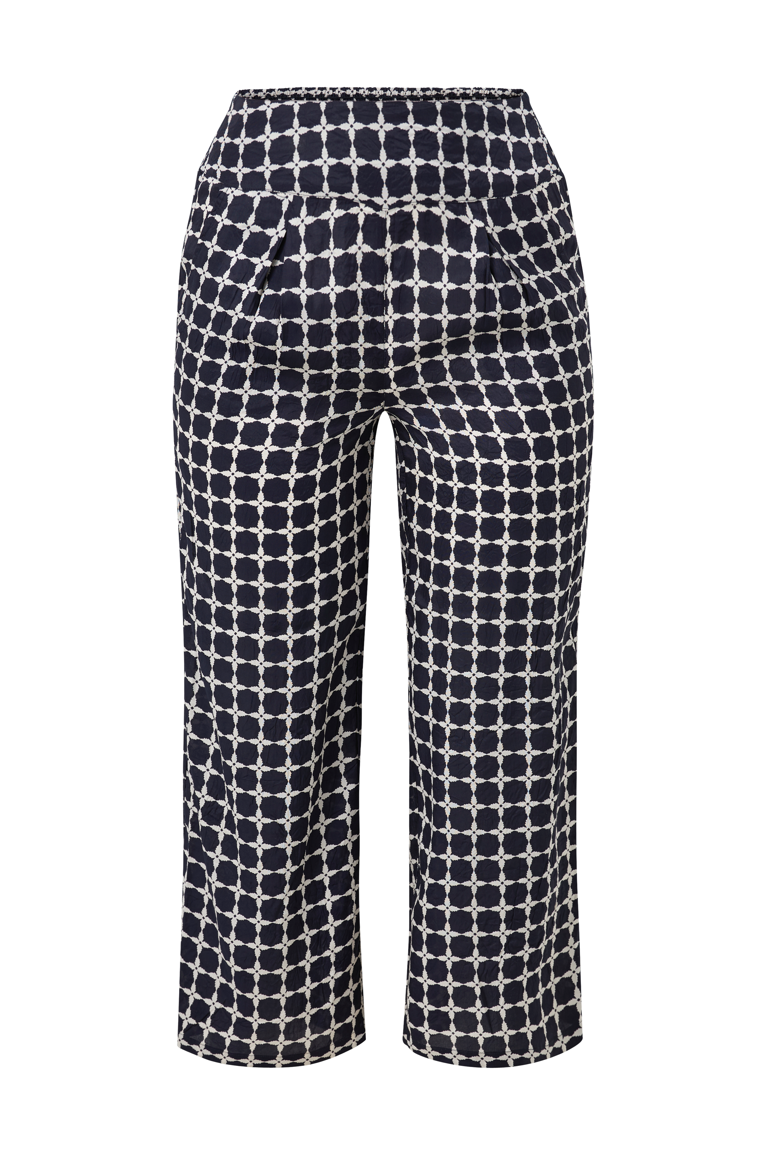 Vide bukser i tynd, let krøllet viskose med fin glans. Skøn model med bred smockelastik i taljen bagpå og lommer i siderne. Benlængde ca. 67 cm i str. S.