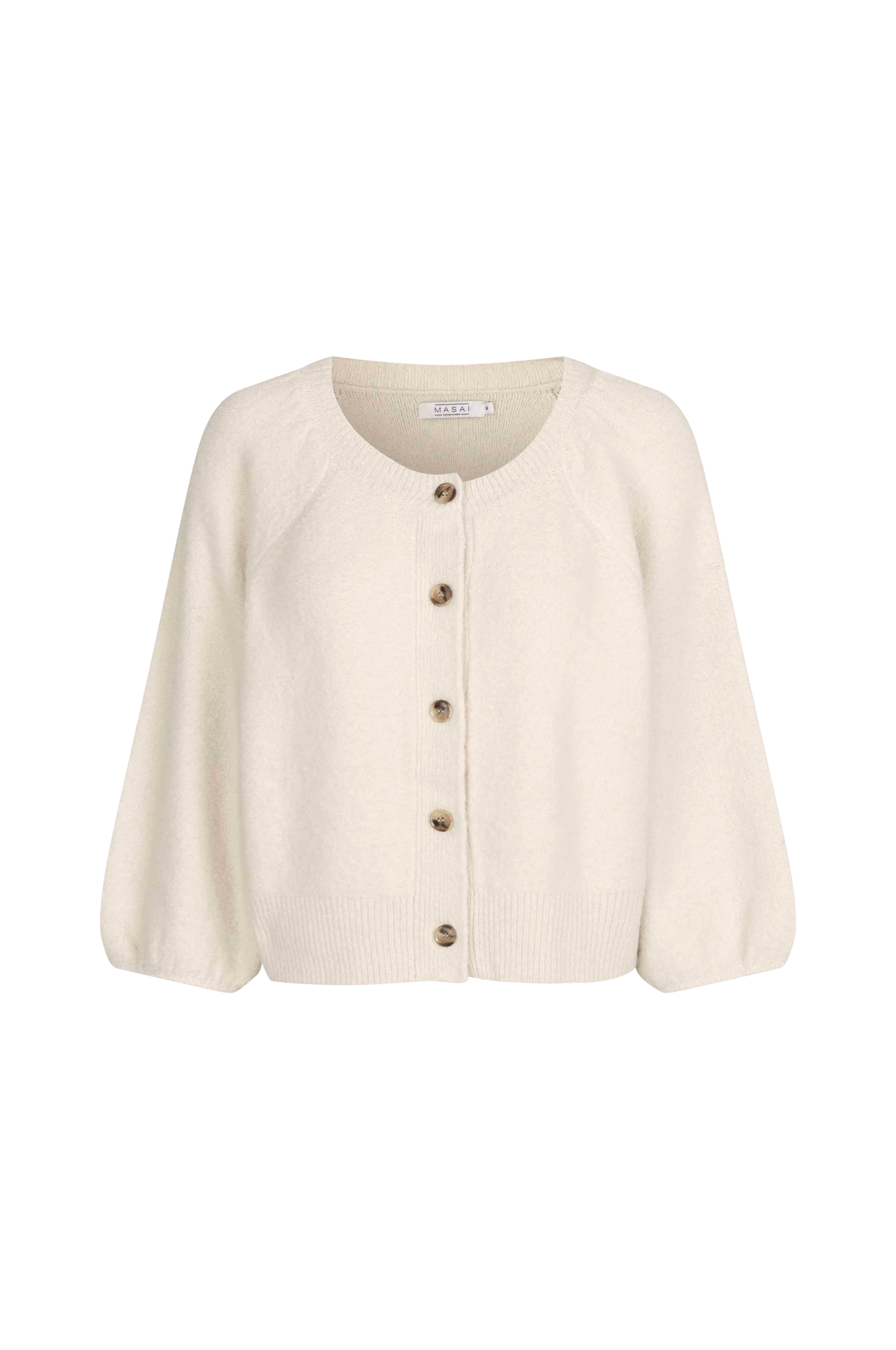 • Strikket cardigan i uldblanding• Rund, ribbet halsudskæring• Lukning med knapper• 3/4 lange ballonærmer• Let samling på skuldrene• Ribstrik ved nederste kant