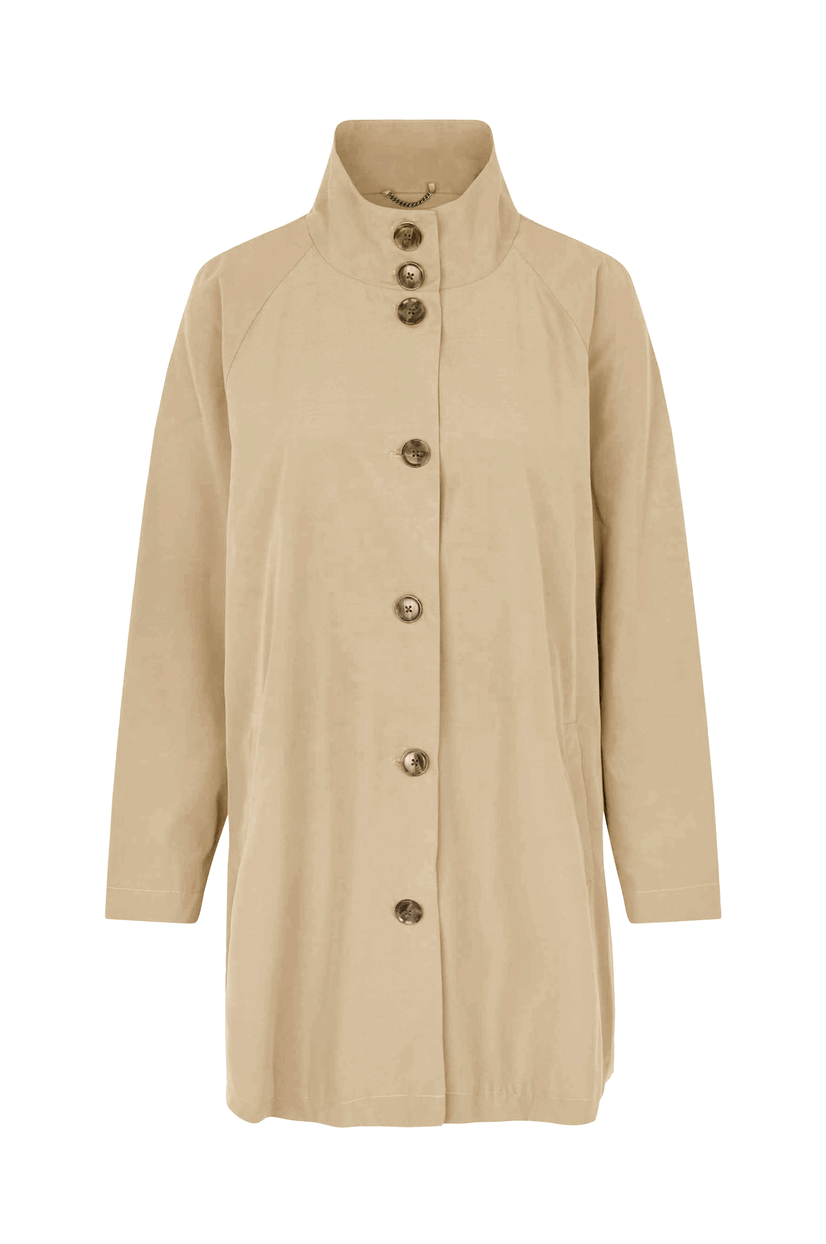 • Frakke i bomuldsblanding med mat overflade• Høj krave• Knaplukning• Sidelommer• Vævet, glat for• Længde: 84 cm i størrelse S
