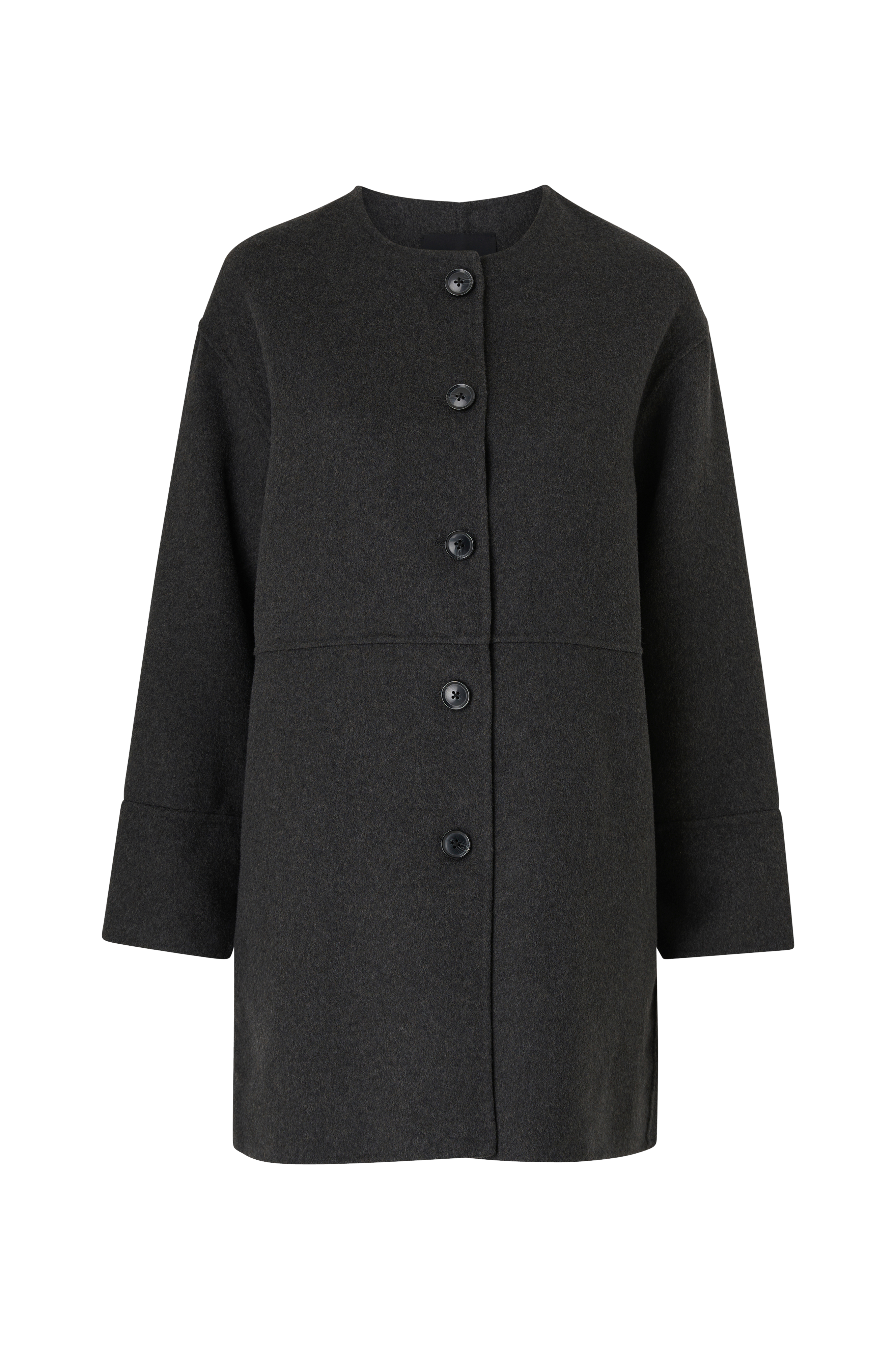 • Frakke i uldblanding• Rund halsudskæring• Knaplukning• Lommer i siderne• Løs, lige pasform• Længde: 90 cm i størrelse XS