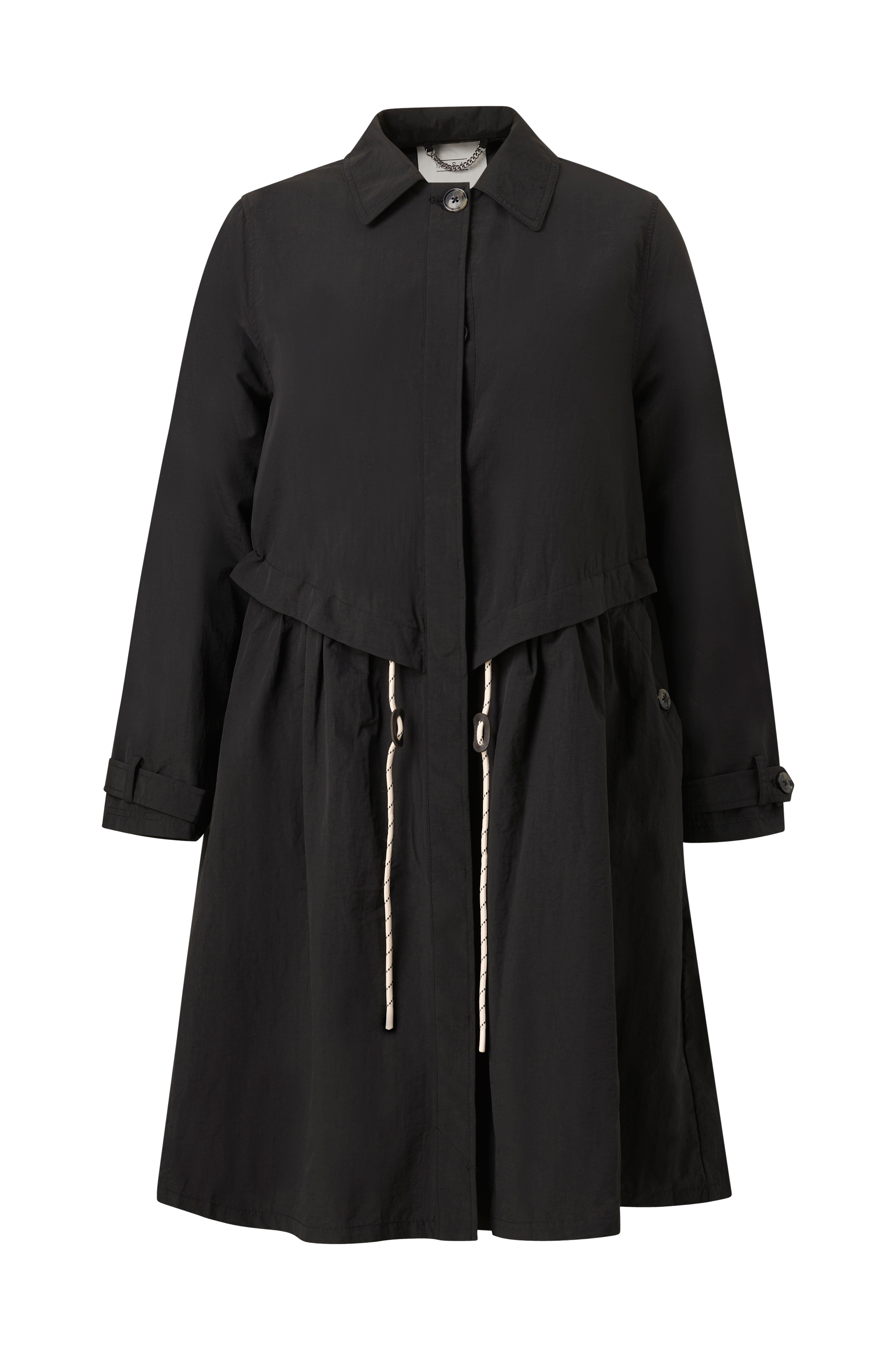En a-formet frakke som er designet i en tynd og let kvalitet. Skjult lukning hele vejen ned undtagen den øverste knap. Løbegang i taljen og sidelommer med knap. Dekorativ knaptamp i ærmekant. Længde ca. 108 cm i str. S.