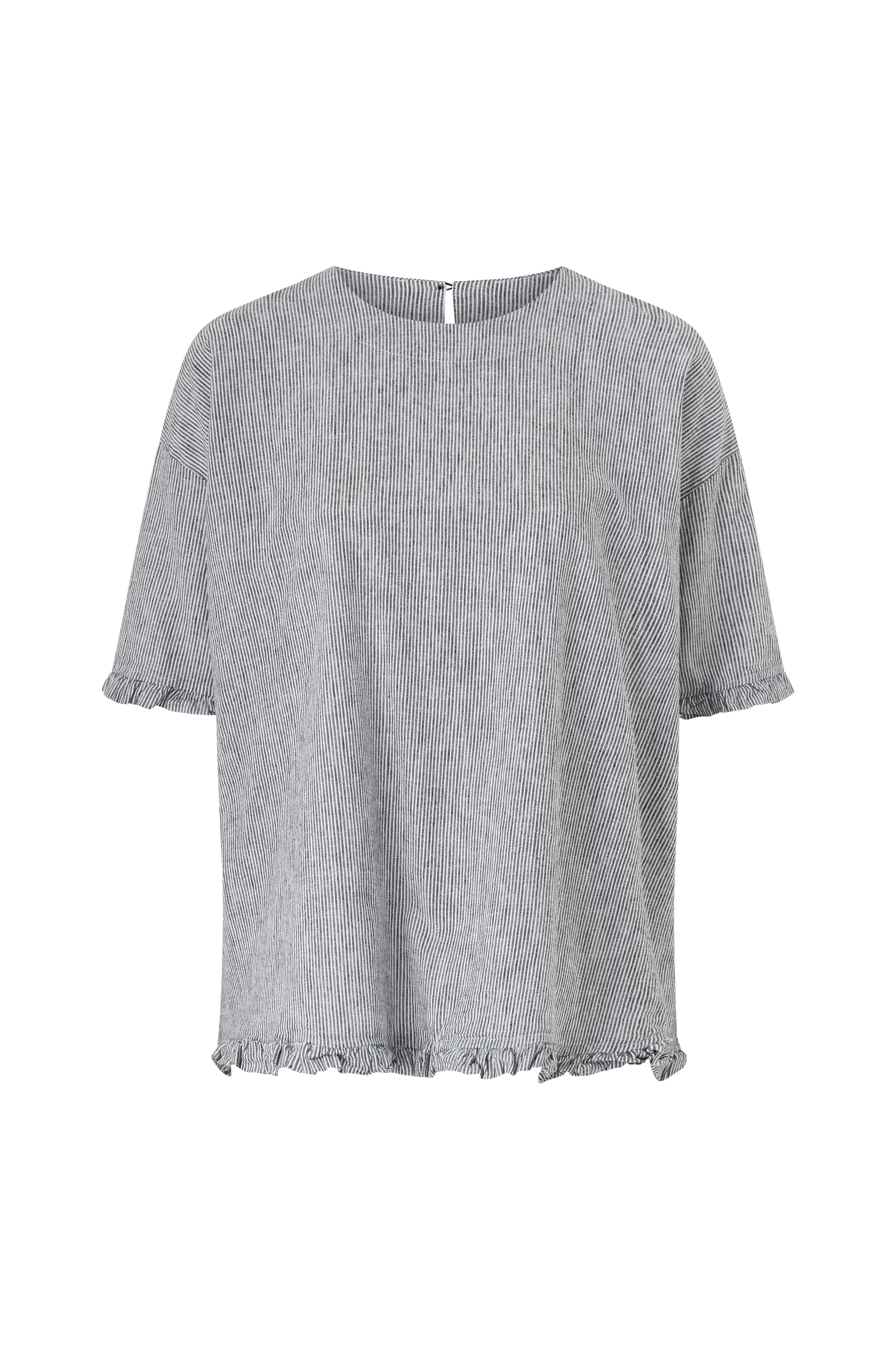 • Bred model• Rund hals med knap i nakken• Nedsænket skulder• Kort ærme• Flæsekant ved ærmeafslutningerne og nederst