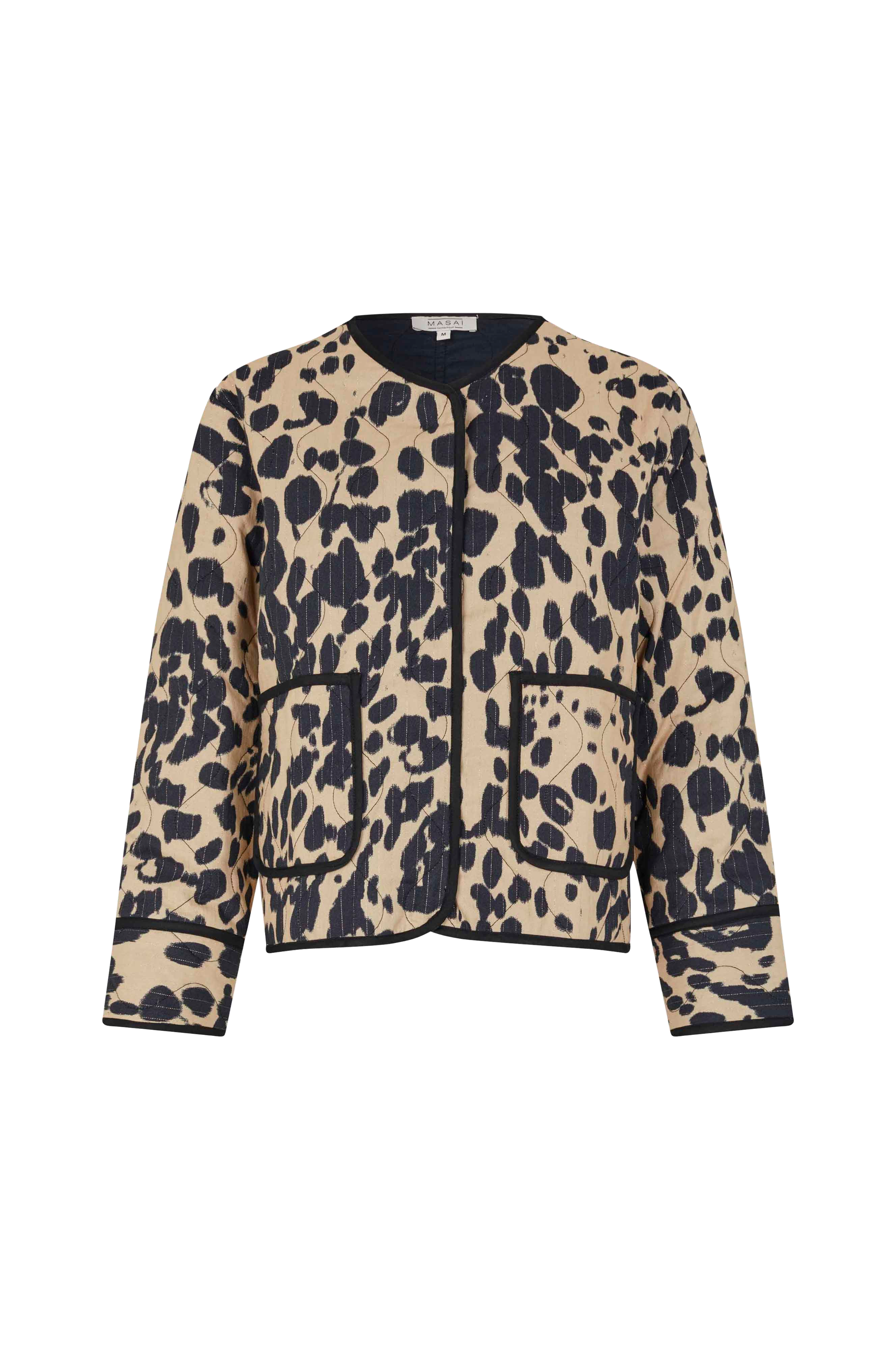 • Quiltet, leopardmønstret jakke• V-formet halsudskæring• Lukning med skjulte knapper foran• Lange ærmer• To åbne lommer foran• Længde: 56 cm i størrelse