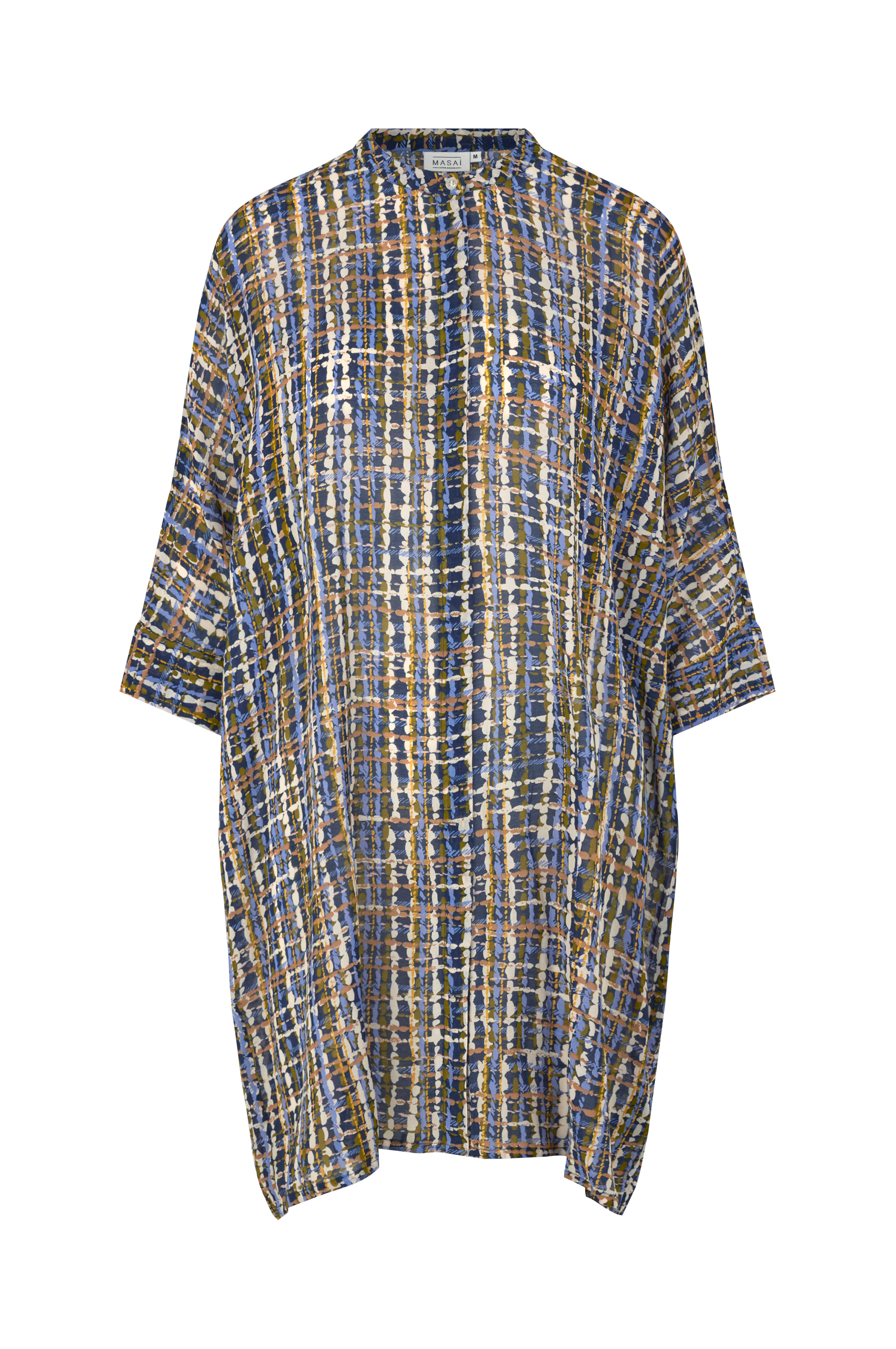 • Model med svaj i chiffon• Rund hals med lille kant• Knaplukning foran hele vejen frem med skjulte knapper• Nedsænket skulder med 3/4 langt ærme• Længde: 91 cm i størrelse S