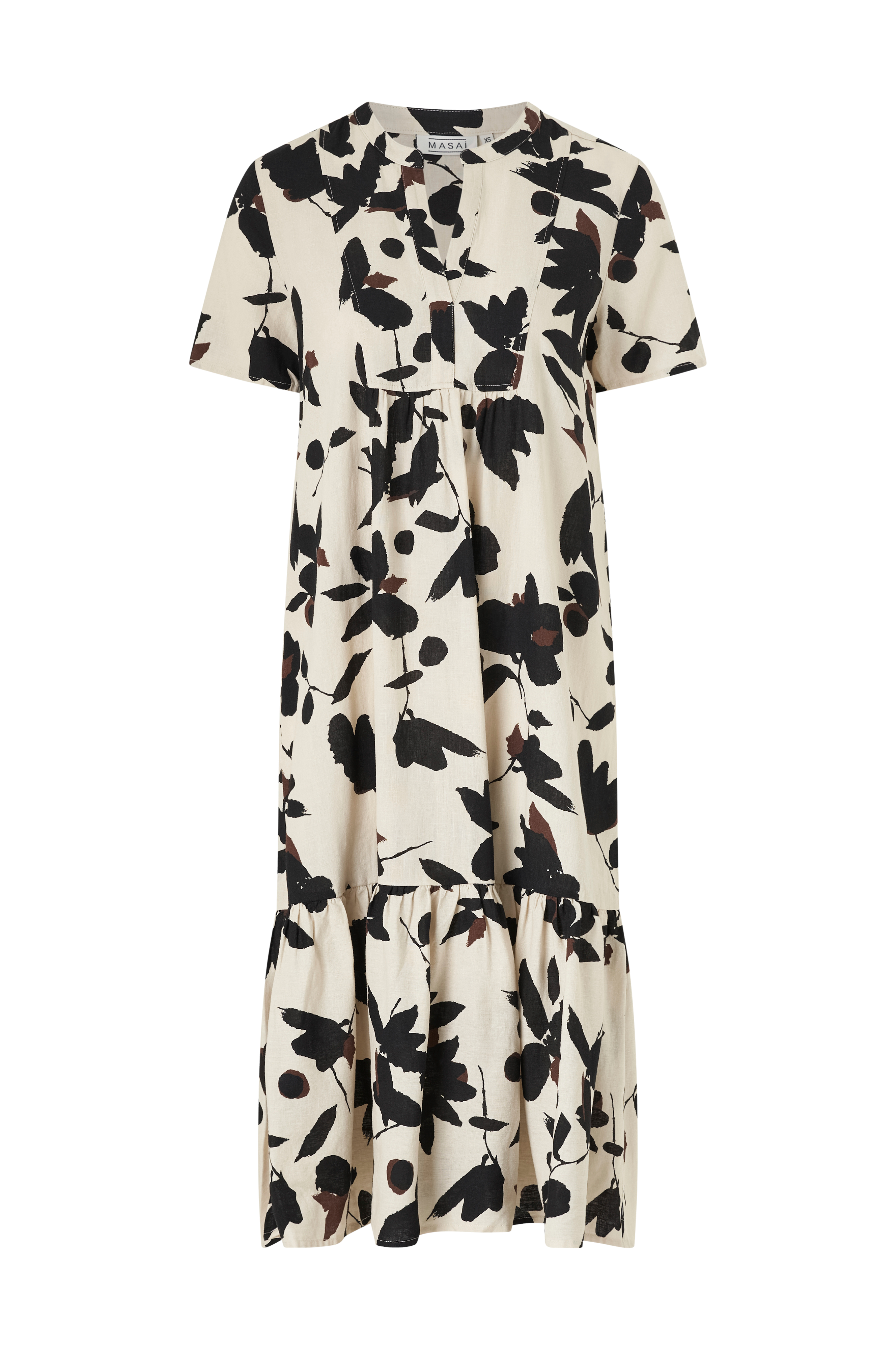 • Mønstret, kortærmet kjole i hørblanding• Rund halsudskæring med ventilation foran• Rynket detalje oppe foran• Volant ved nederste kant• Længde: 117 cm i størrelse XS