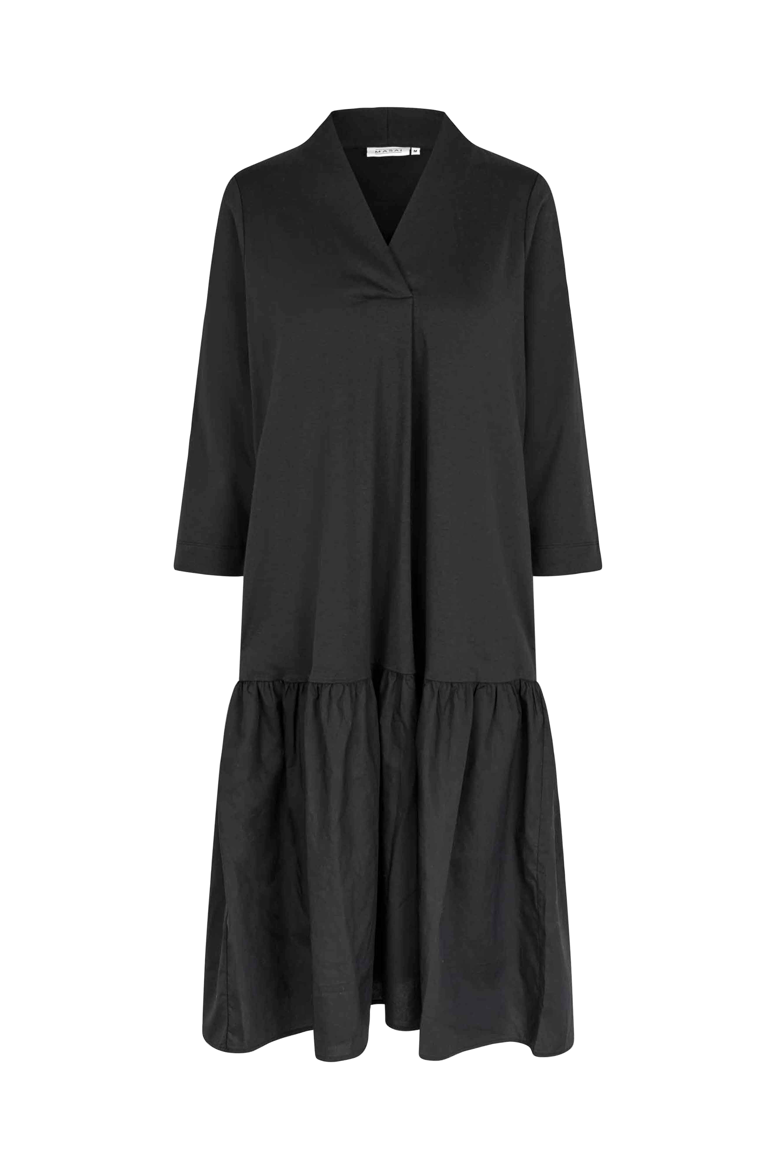 • Model med svaj i jersey• V-formet halsudskæring med bokslæg nedenfor• Lige, 3/4 langt ærme• Indlagte sidelommer• Bred, vævet volant ved nederste kant• Længde: 111 cm i størrelse M