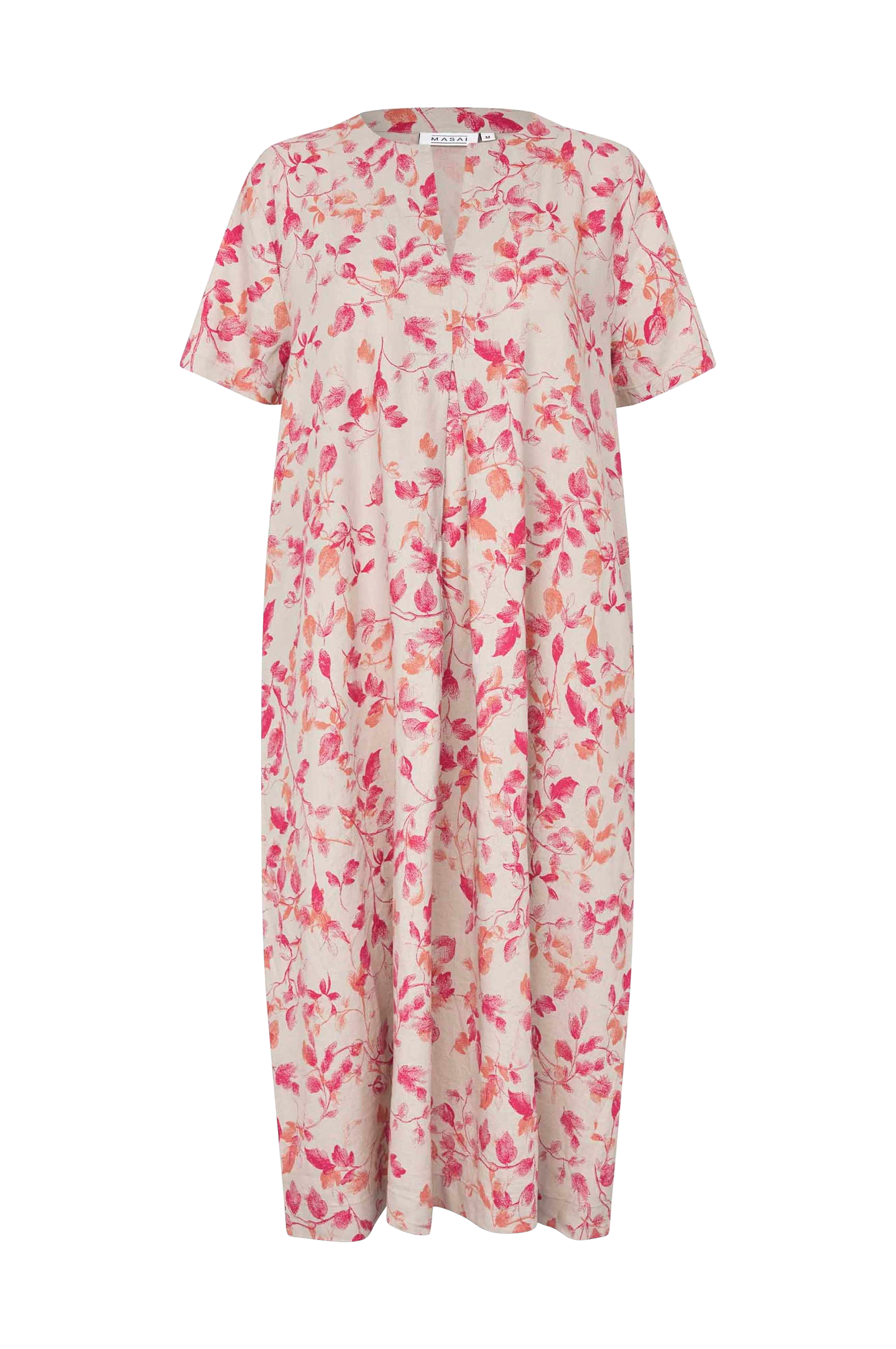 • Mønstret kjole i hørblanding• V-udskæring• Korte ærmer• Modfold foran• Lommer i siderne• Længde: 109 cm i størrelse S