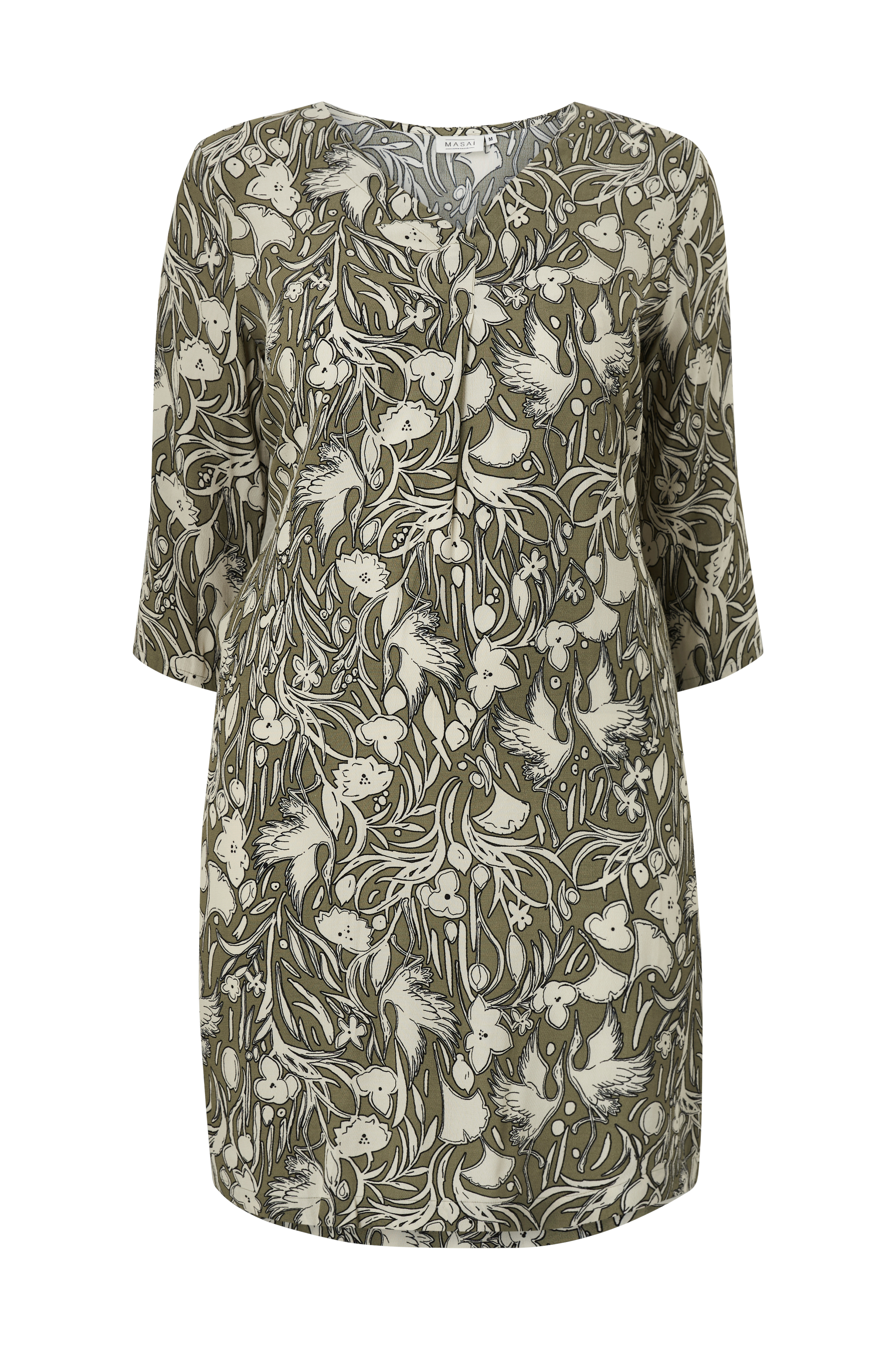 • A-linjeformet kjole med printet mønster• V-formet halsudskæring• Sidelommer• Bølgeformet detalje på ryggen• 3/4 lange ærmer• Længde: 109 cm i størrelse M