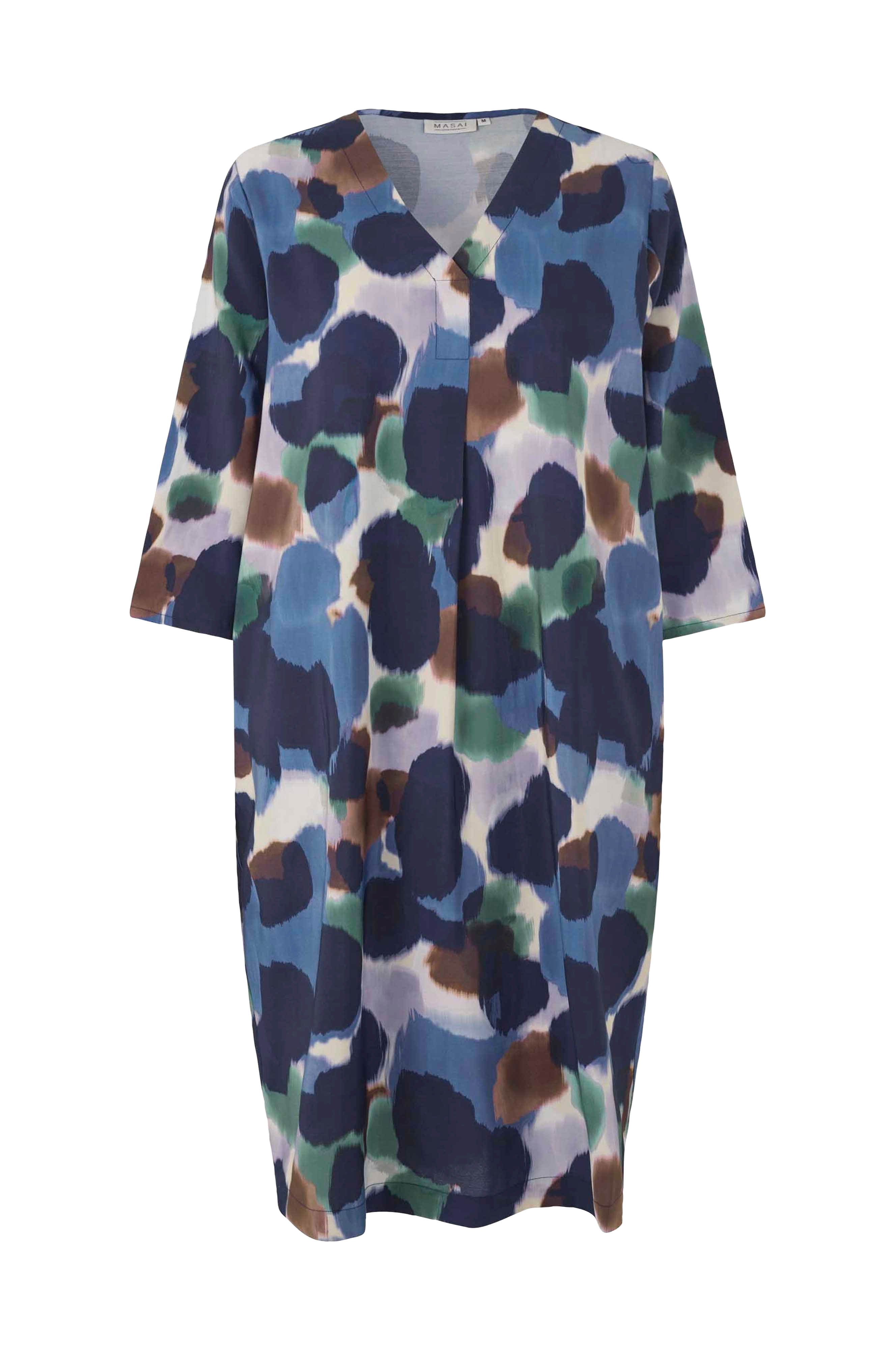 • Mønstret kjole• V-formet halsudskæring• 3/4 lange ærmer• Sidelommer• Fold bagpå• Længde: 100 cm i størrelse S