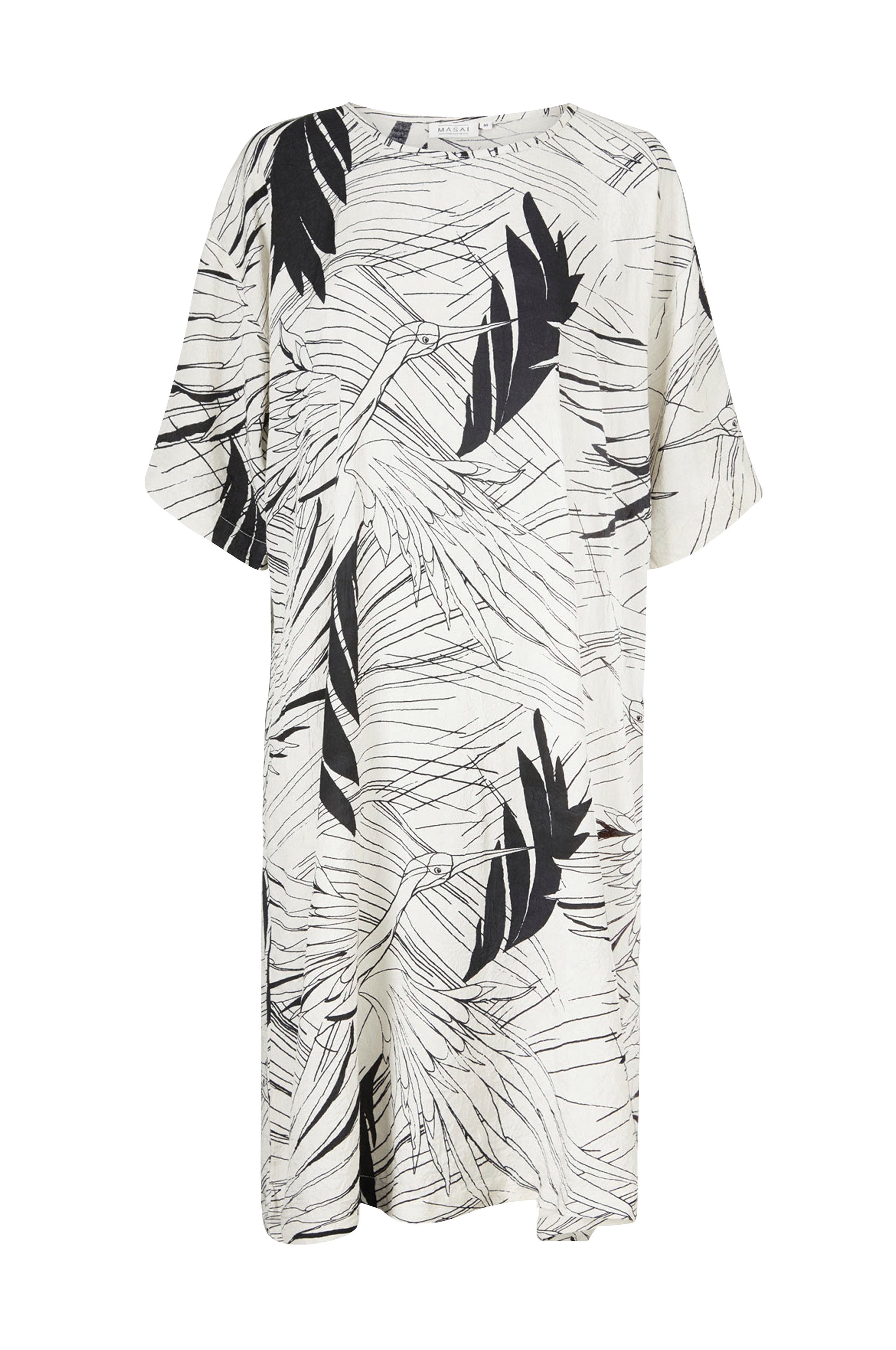 Lige model med løst snit og lav skulder med halvlangt, vidt ærme. Rund hals med smal, påsyet kant. Længde ca. 105 cm i str. S.