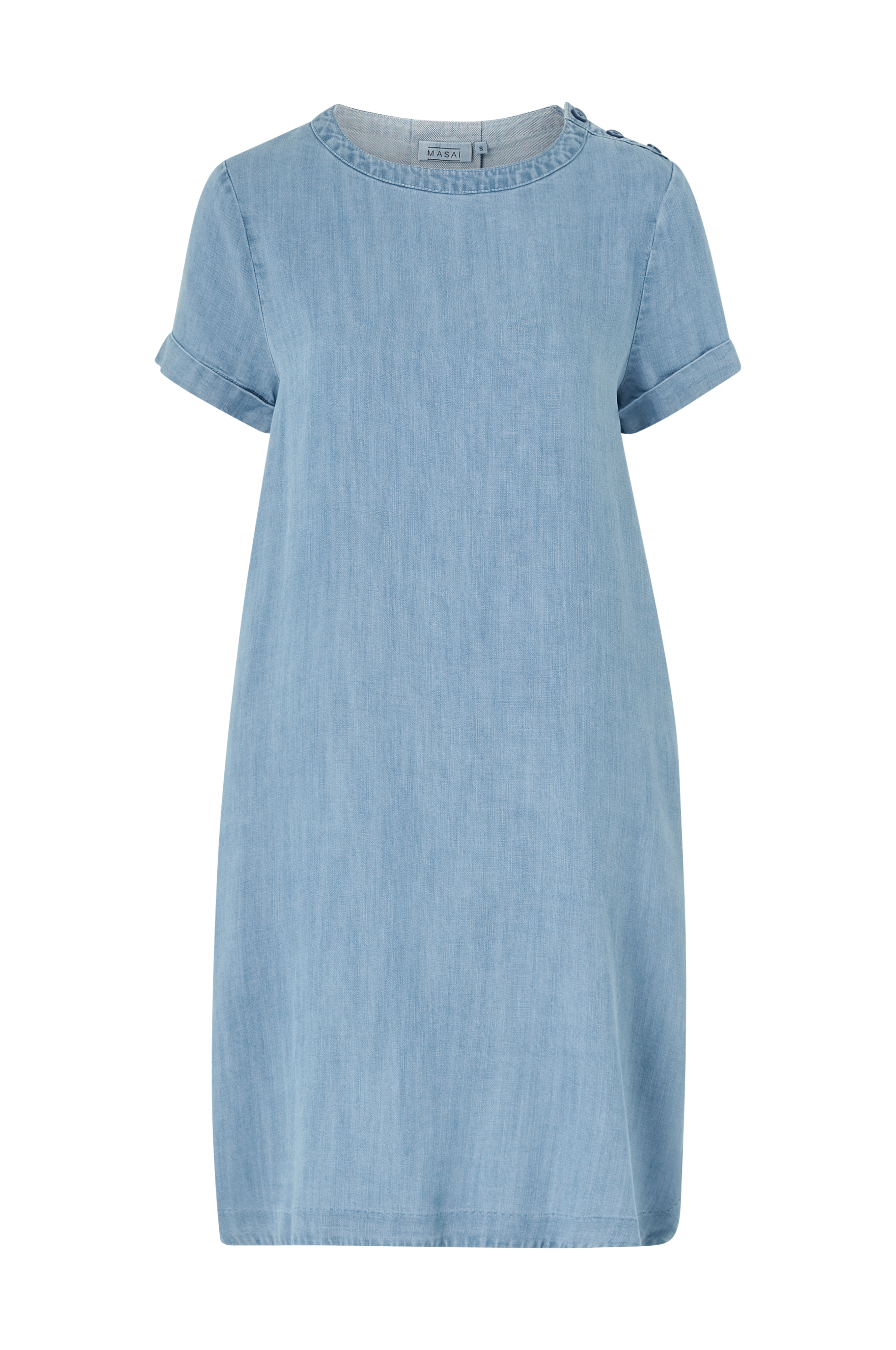 • Model med svaj i blødt denim• Rund hals med knaplukning foran på en skulder• Kort ærme med oprullet• Sidelommer• Korte, afrundede slidser nede i siderne• Længde: 97 cm i størrelse S
