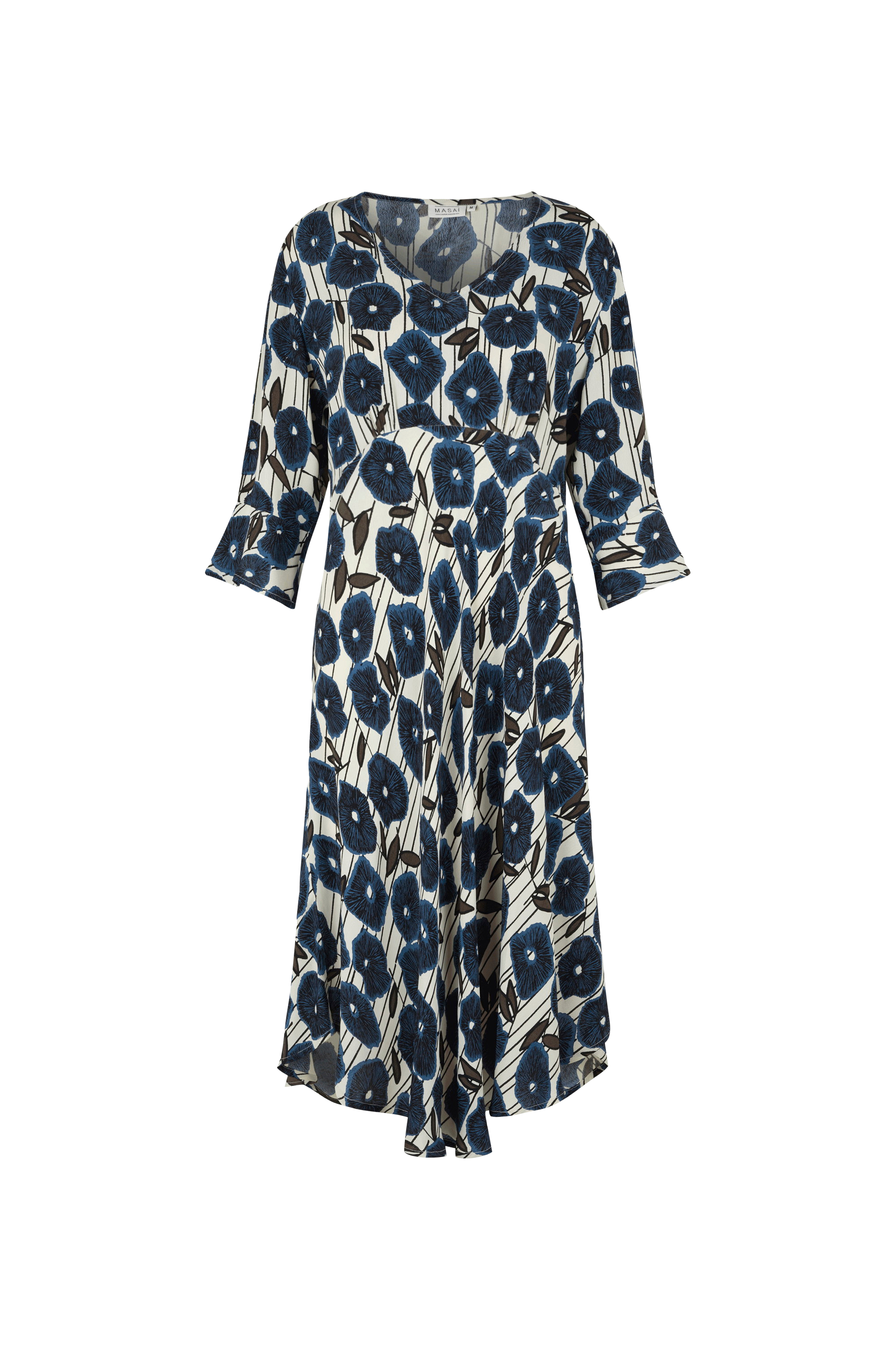• Let figursyet model• V-formet halsudskæring• 3/4 langt ærme med volant ved manchetterne• Afrundet udskæring foran• Klokkeformede bukser• Længde: 115 cm i størrelse S