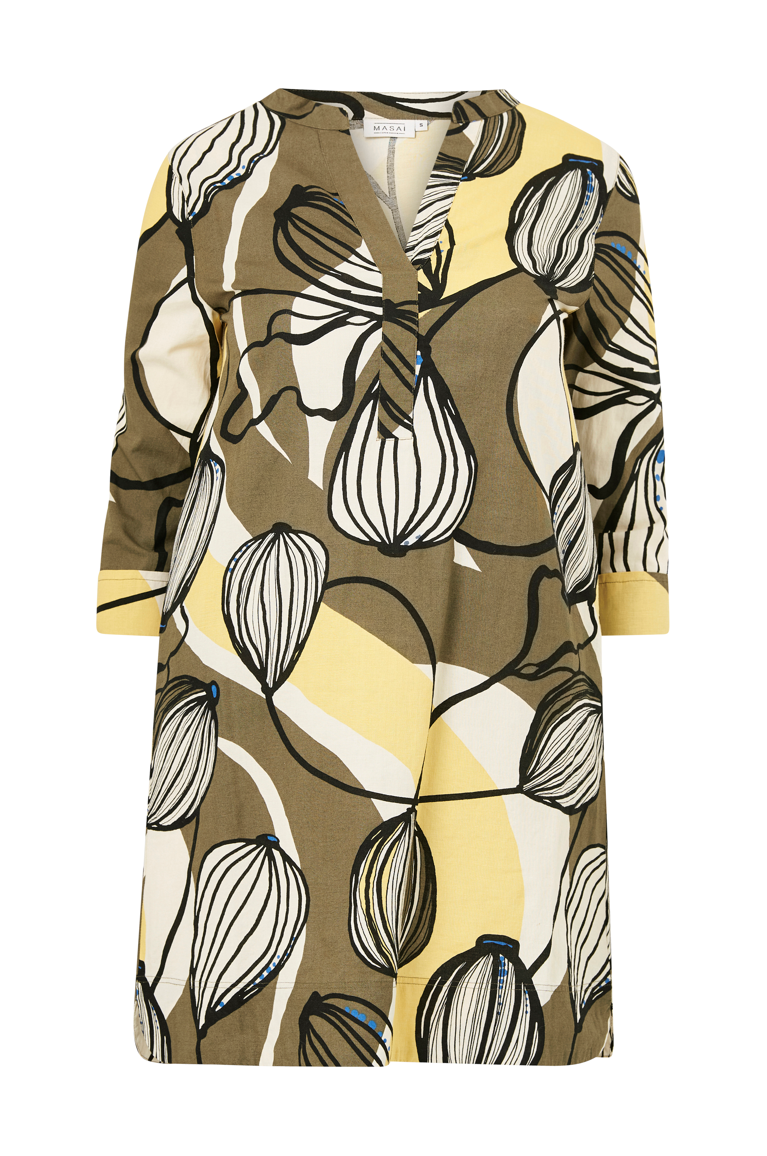 • Mønstret kjole i hørblanding• V-udskæring• 3/4 lange ærmer• Lommer i siderne• Længde: 95 cm i størrelse S