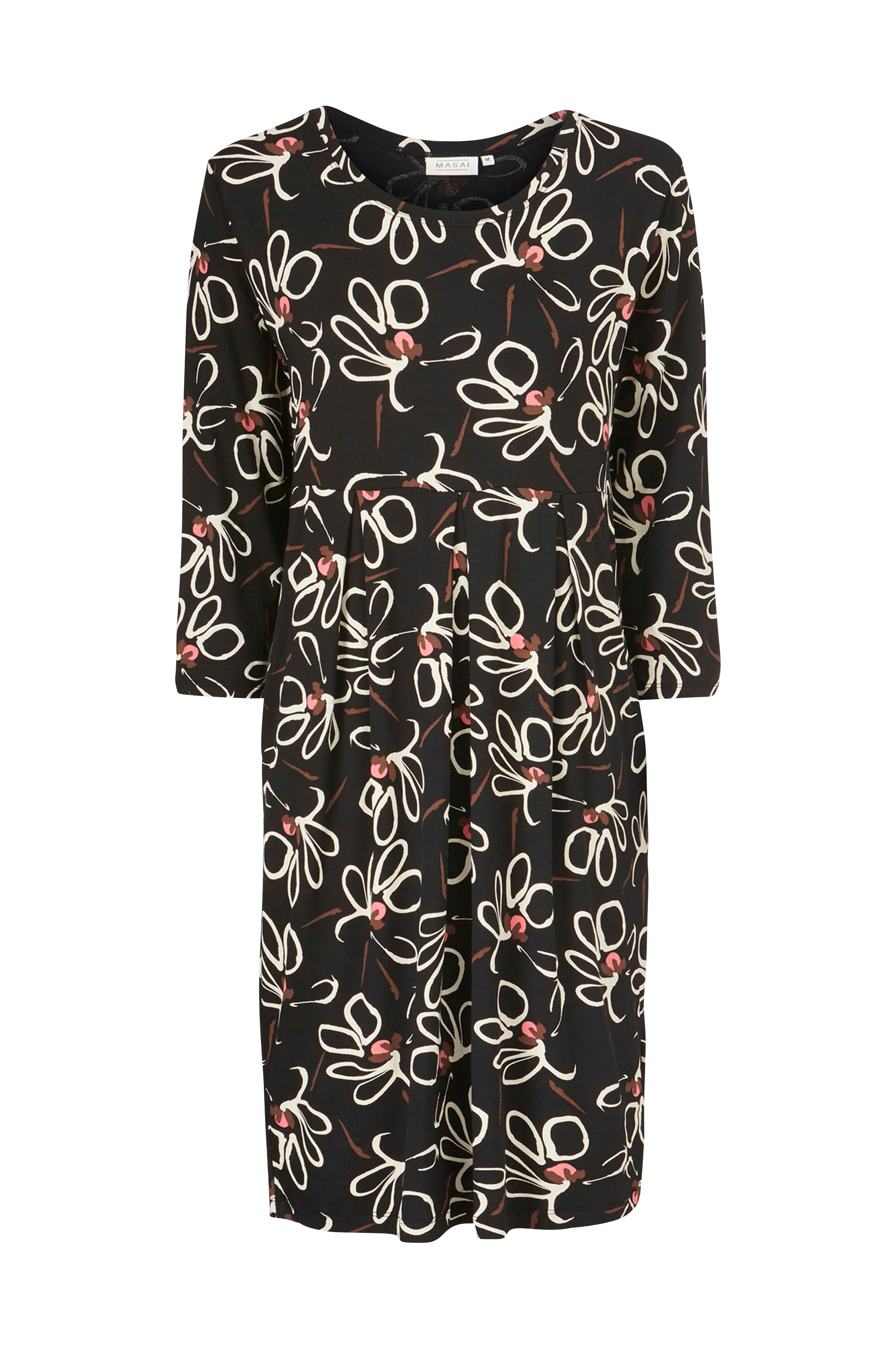 - A-formet model- Markeret talje med læg rundt om- Rund hals med lille kant- Langt ærme- Indsatte sidelommer- Længde: 100 cm i str. S