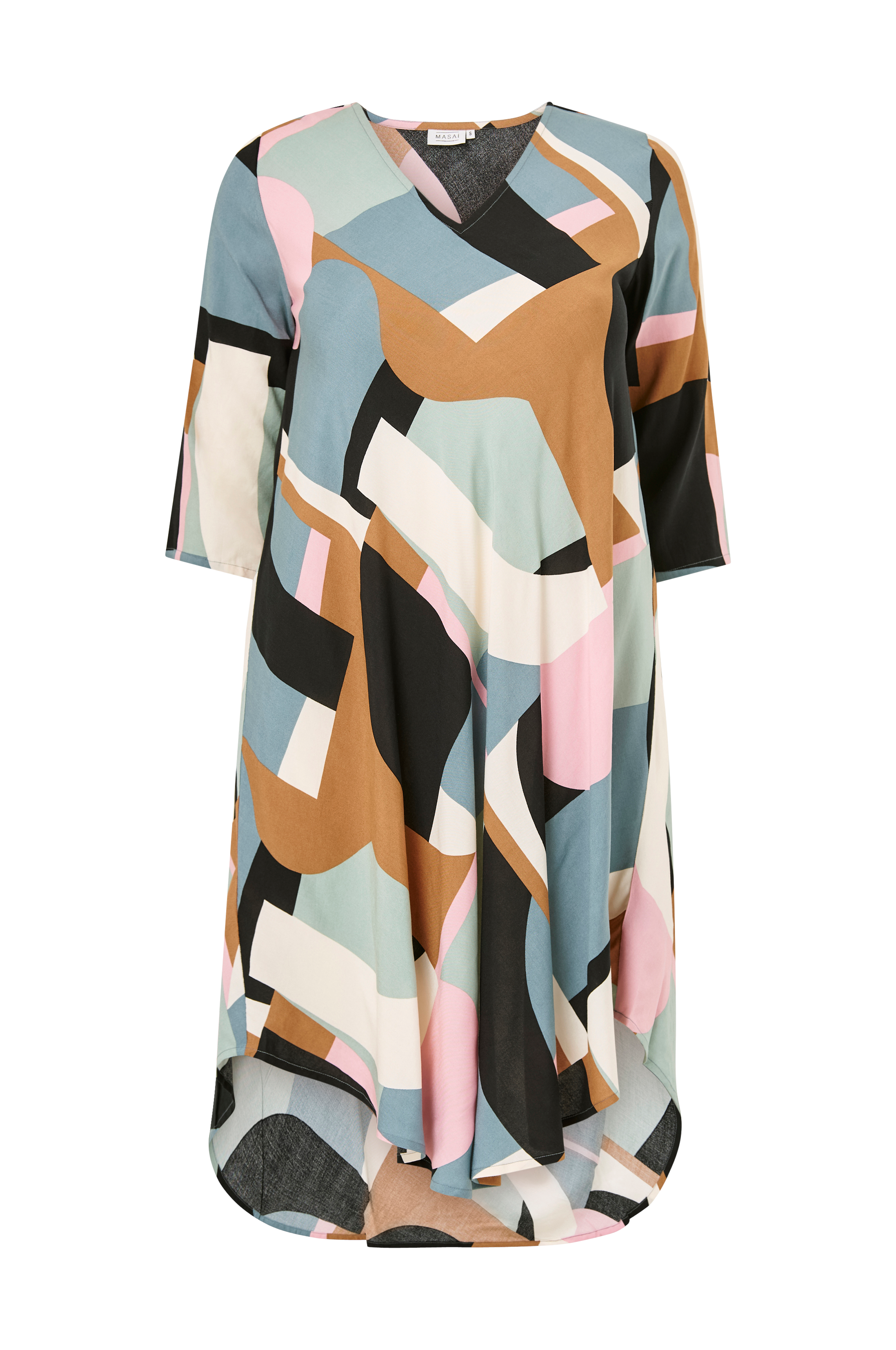 • V-udskæring• 3/4 lange ærmer• Afrundet søm• Længde: 113 cm i størrelse S