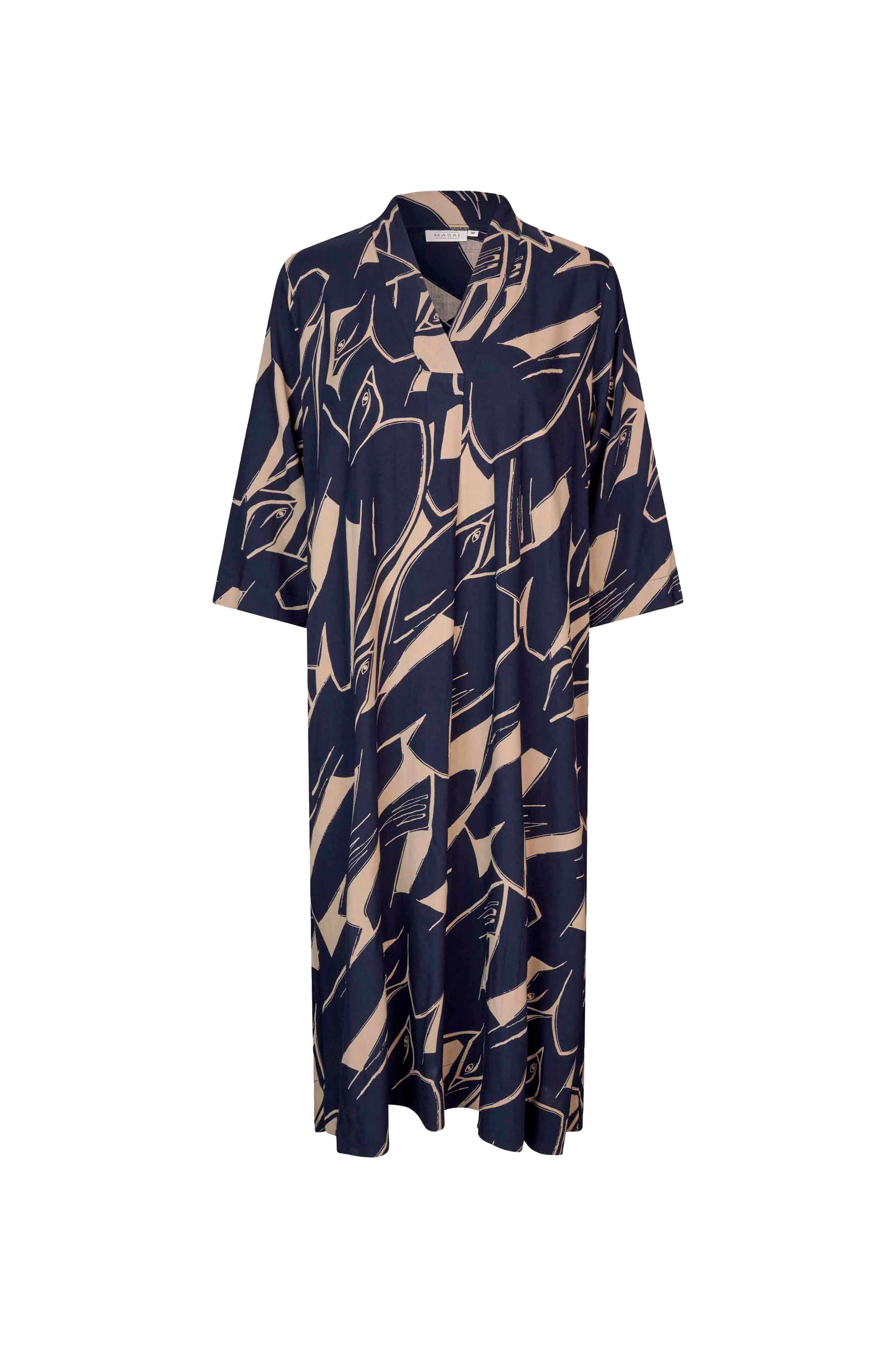 • Kjole i luftigt, let, mønstret materiale• V-formet halsudskæring med slå-om detalje• 3/4 lange arme med kort slids ved manchetterne• Længde: 113 cm i størrelse M