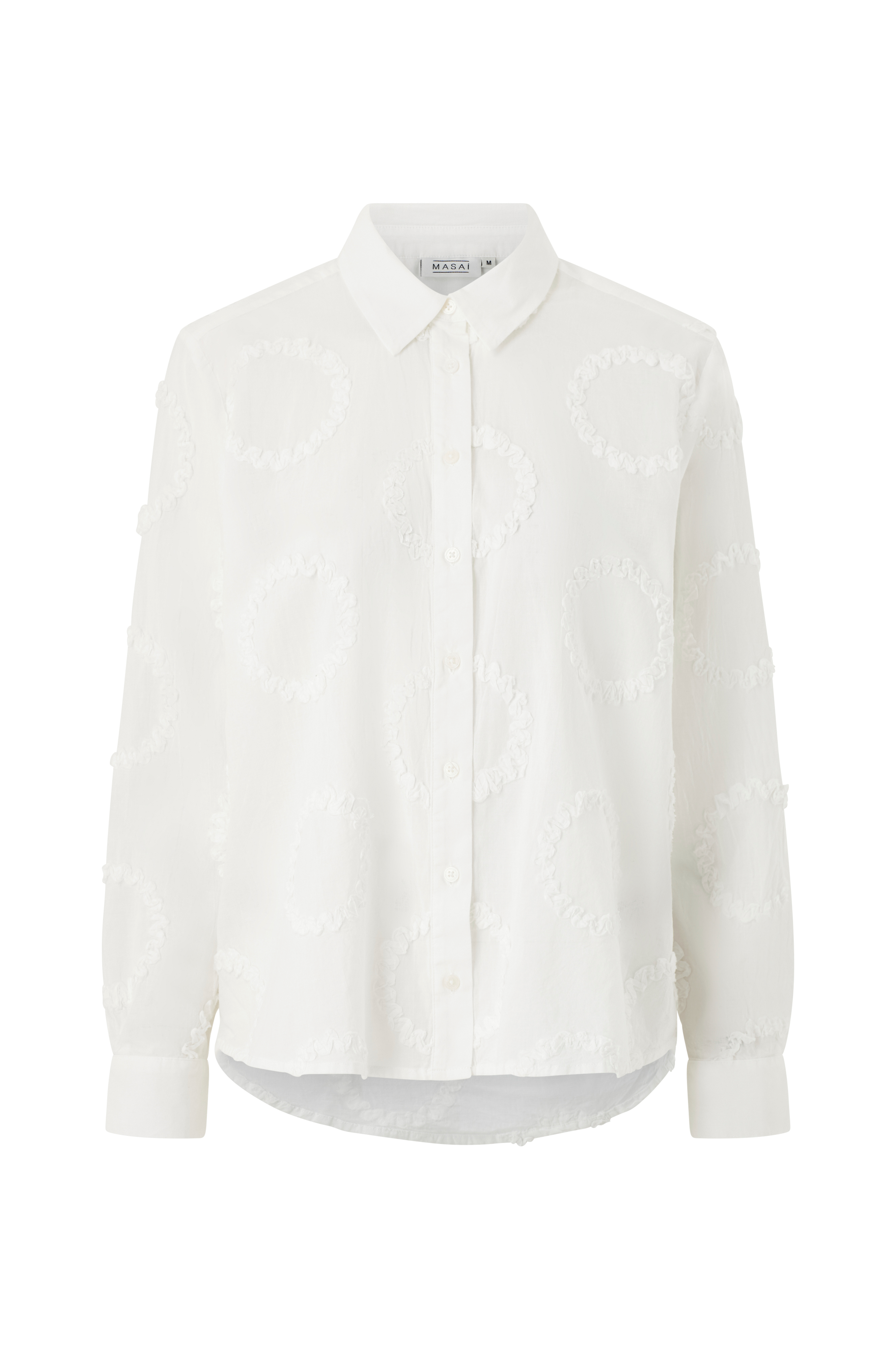 • Bred model med svaj med påsyede applikationer overalt• Lille krave• Knapper foran• Langt ærme med manchet• Afrundet søm med længere bagside
