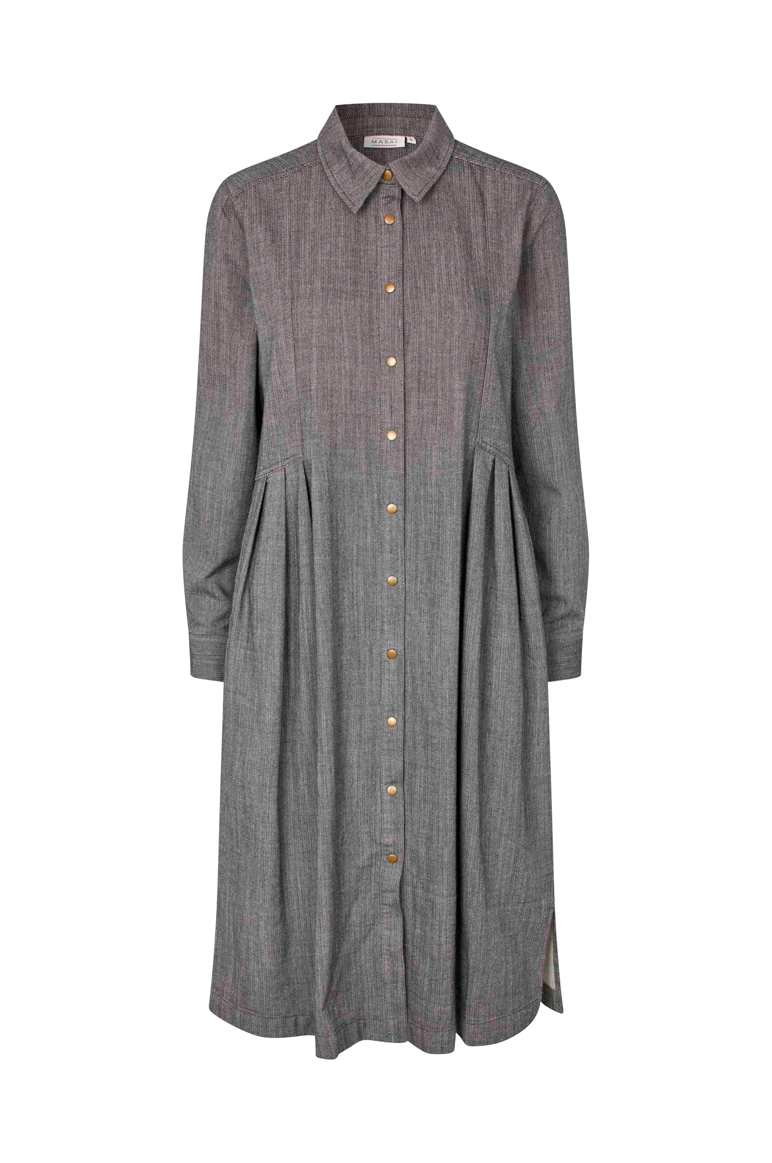 • Kjole i bomuldsblanding med klassisk skjortekrave• A-linjeformet model• Trykknapper hele vejen frem• Manchetter med to knapper ved manchetterne• Drapering ved taljen• To åbne sidelommer• Modfold i ryggen• Længde: 114 cm i størrelse S