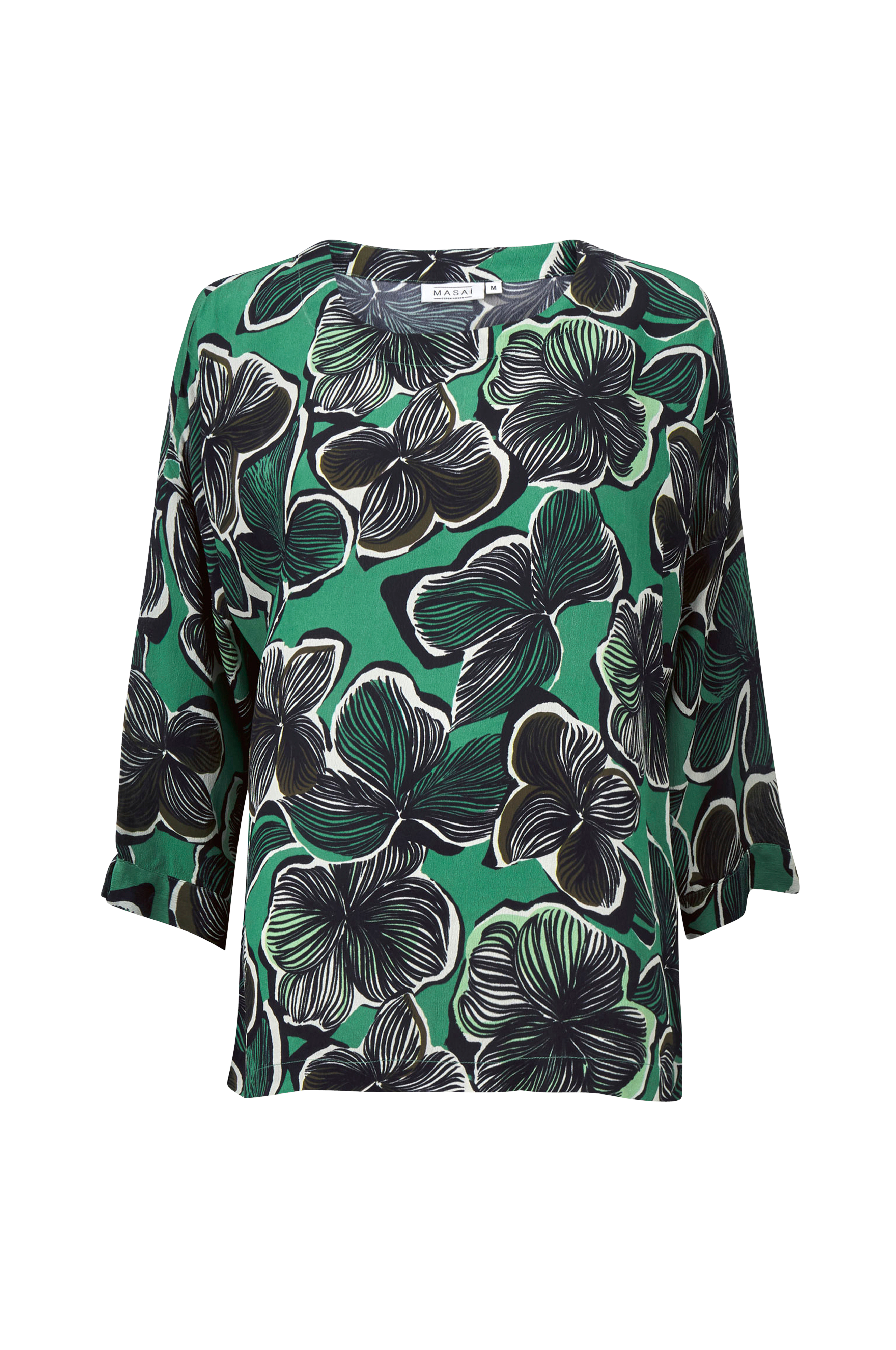 Lige oversizemodel i vævet kvalitet med lav skulder og lige, 3/4-langt ærme. Vid halsudskæring med bred søm samt bred søm i kanten forneden.