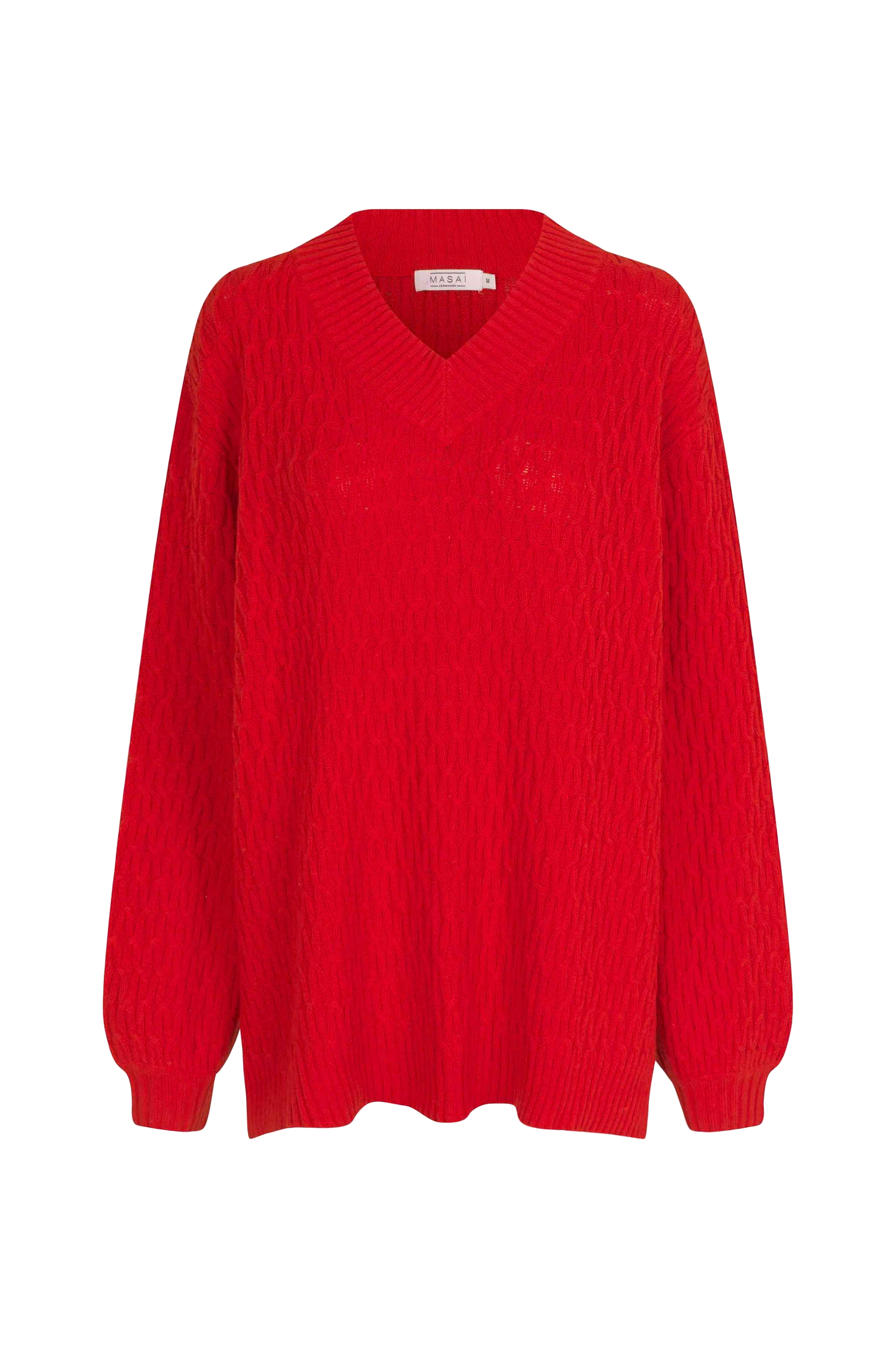 • Lige, strukturstrikket model• V-udskæring med bred ribkant• Langt, bredt ærme med ribmanchet• Søm med slids i siderne og ribstrik