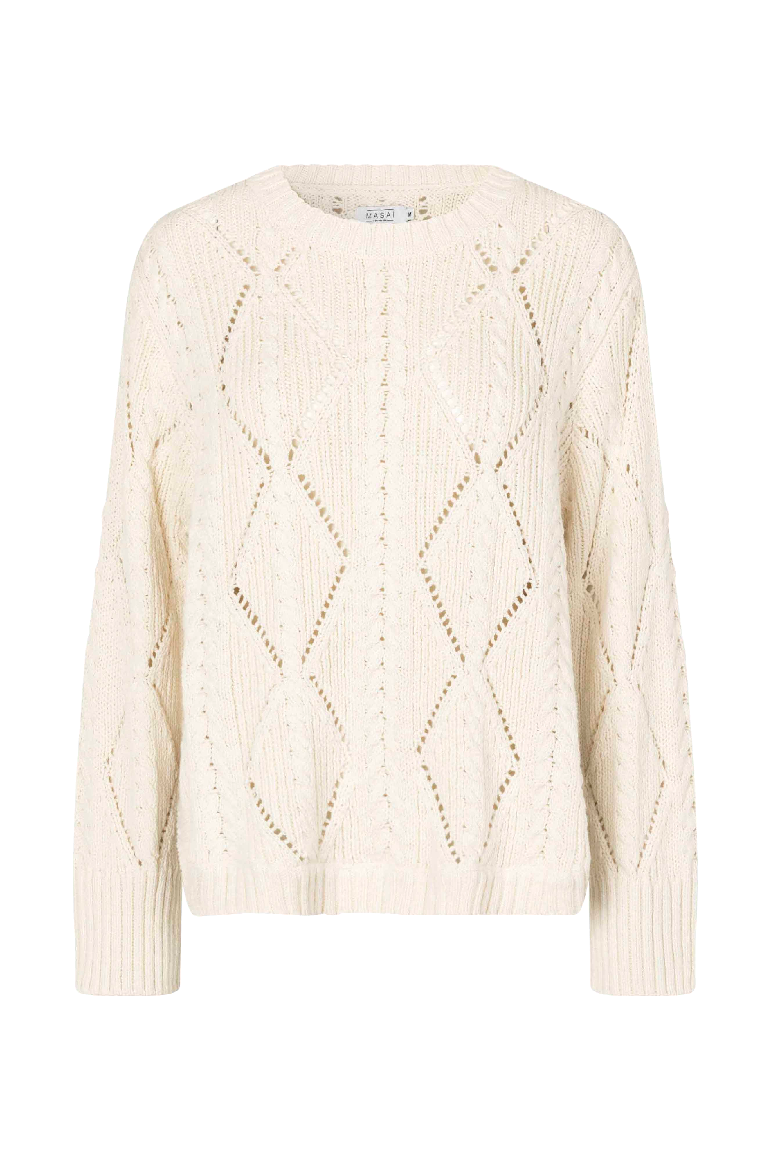 • Lige, mønsterstrikket model• Rund hals• Langt ærme• Afrundede ventilationer nede i siderne• Ribstrik ved manchetterne og ved nederste kant