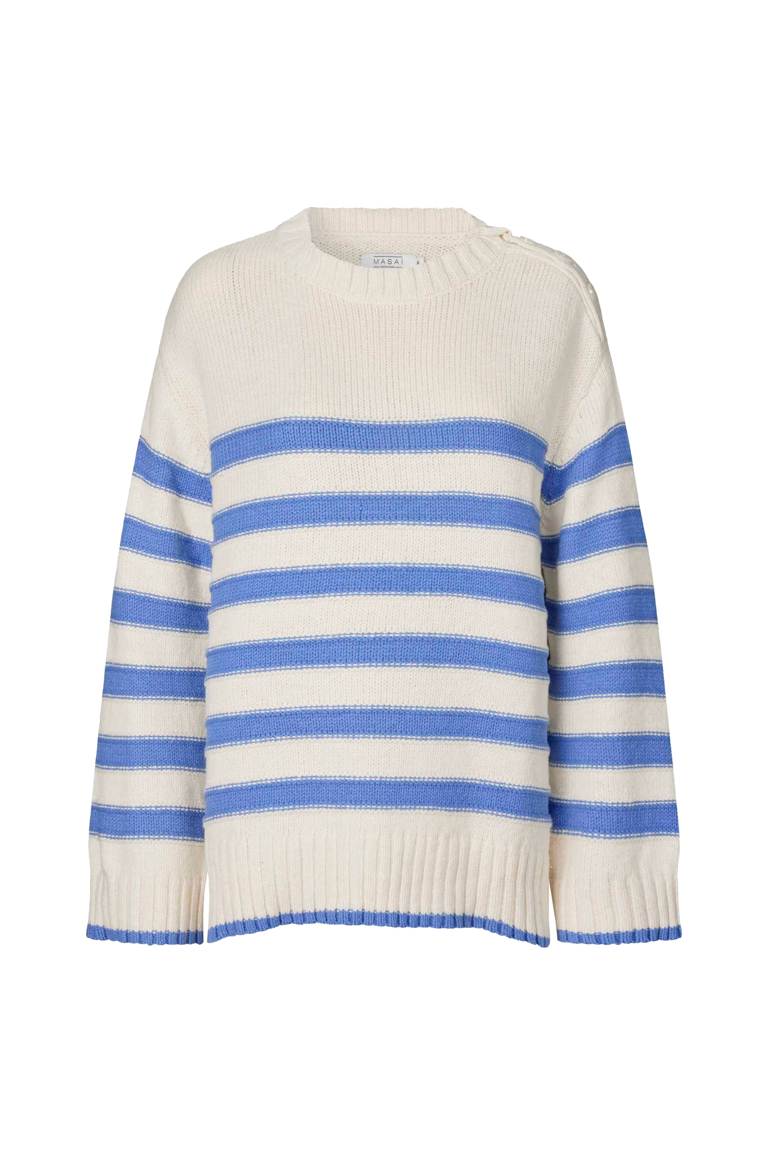 • Strikket trøje i bomuldsblanding• Rund halsudskæring• Knapper på en skulder• Nedsænkede skuldre• Strikkede striber• Ribstrik ved manchetterne og nederst