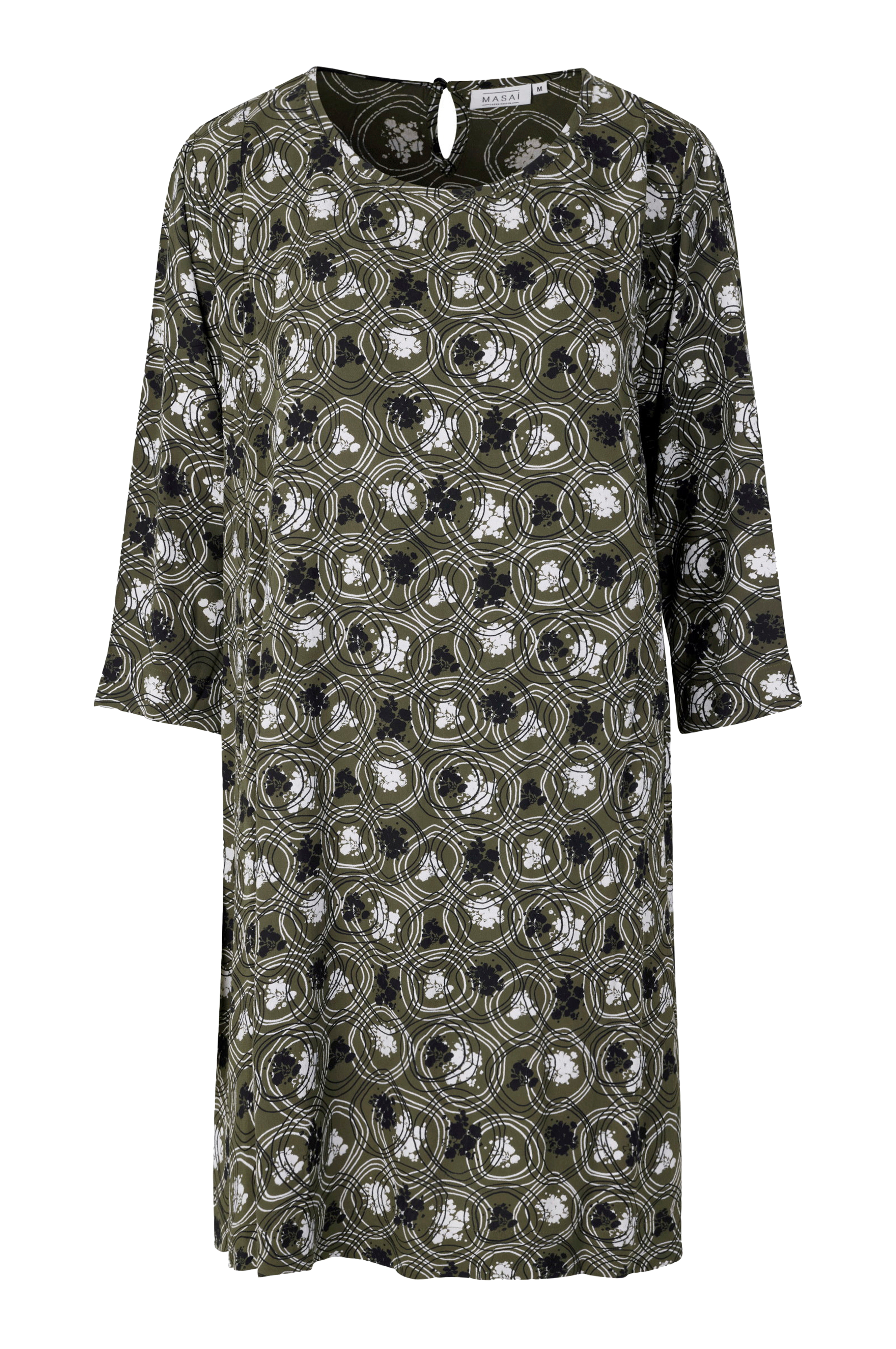 • Rund halsudskæring• Slids med knap i nakken• A-linje design• 3/4 lange ærmer• Længde: 91 cm i størrelse S
