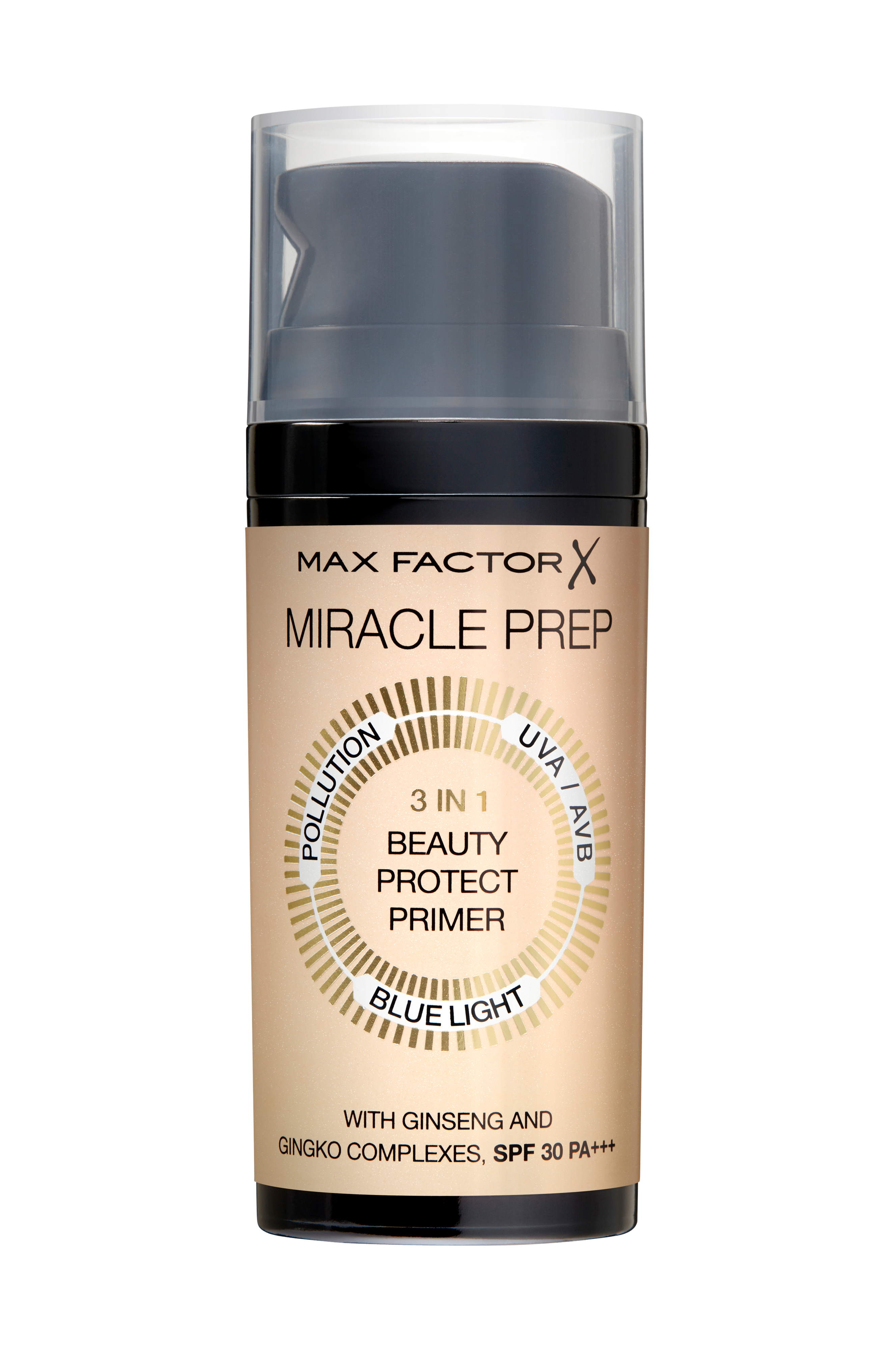 Primer med tredobbelt beskyttelse. Beskytter mod forurening, sollys og blåt lys. Let formel med ginko biloba som beskytter mod forurening og ginseng som fremmer en jævn hudtone. Indeholder SPF 30.Anvendelse: Påfør i ansigtet inden foundation.