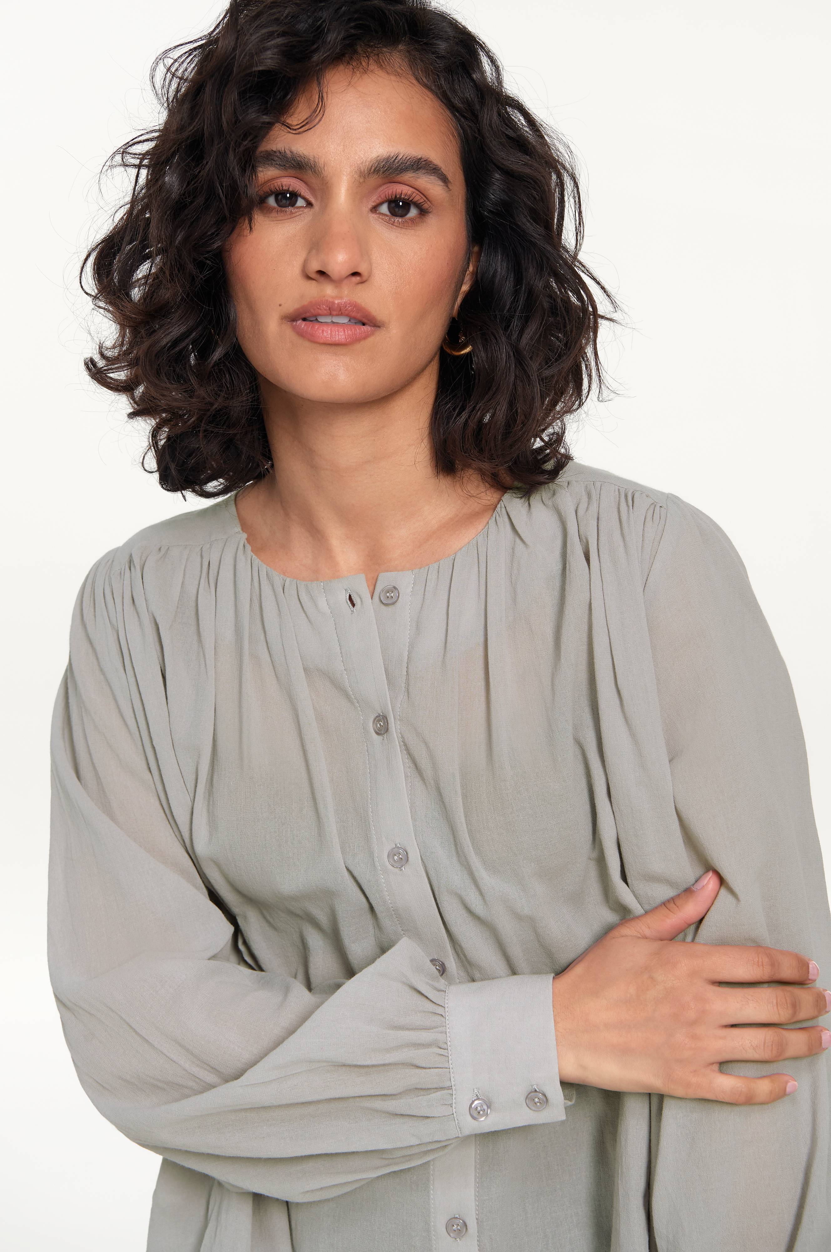 Lige oversizemodel med afskåret skulderbærestykke som har rynkning både foran og bagpå. Langt, vidt ærme med rynkning ved skulderen og manchet i ærmekant.