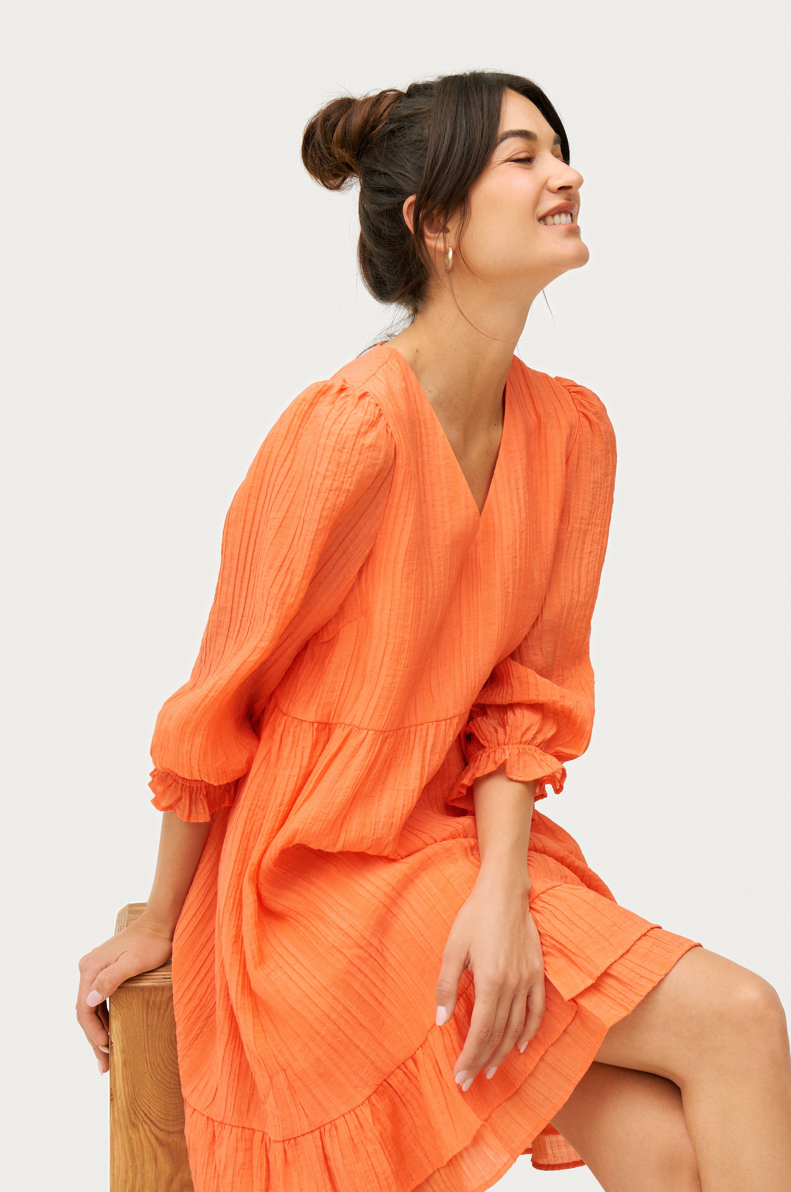 • Kort model med svaj• V-udskæring• 3/4 lange ballonærmer med elastiske ærmeafslutninger• Volant nederst• Kvalitet med strukturmønster• Foret• Længde: 90 cm i størrelse S