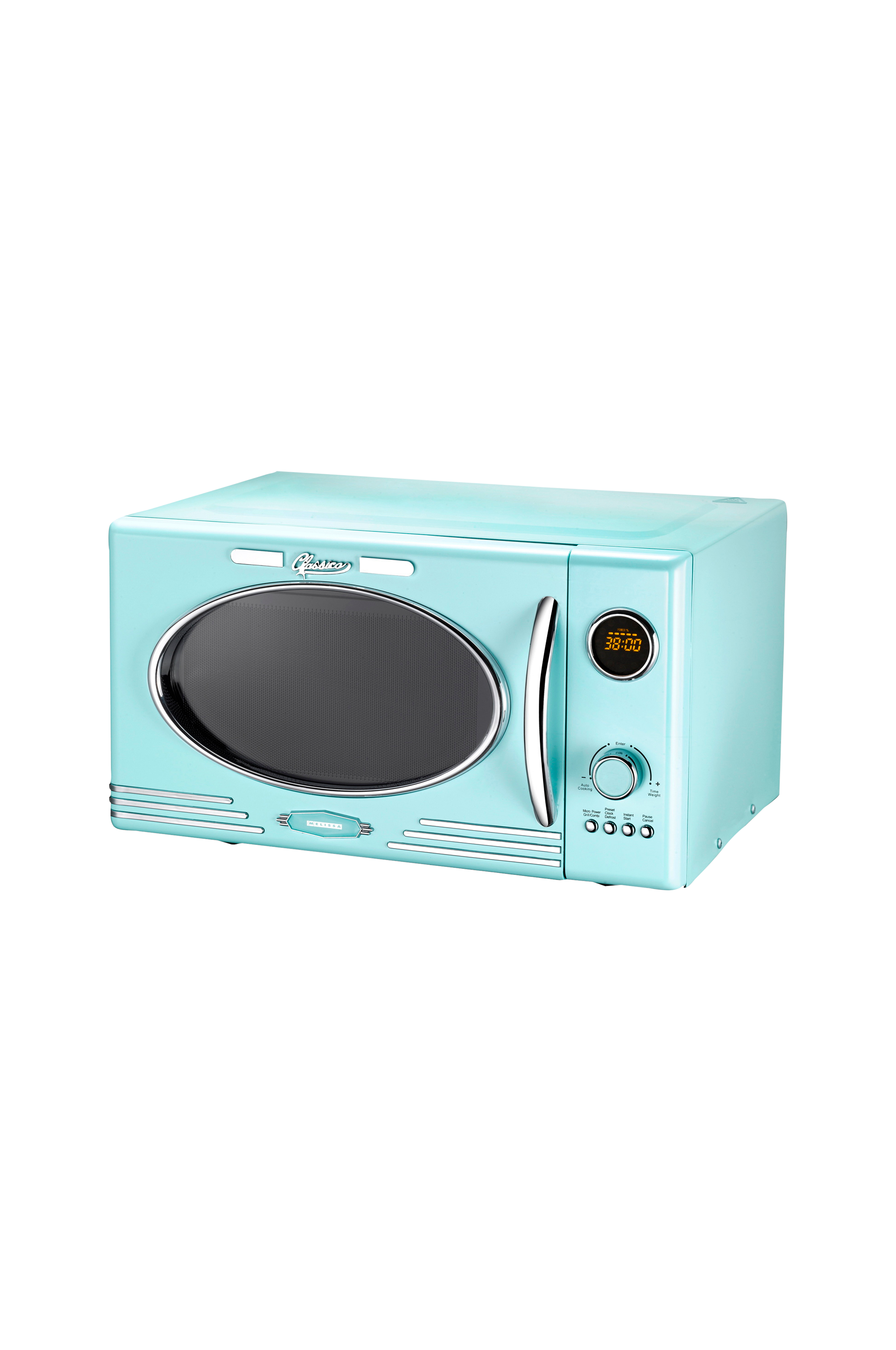Iøjnefaldende blå i retrostil med kromdetaljer.