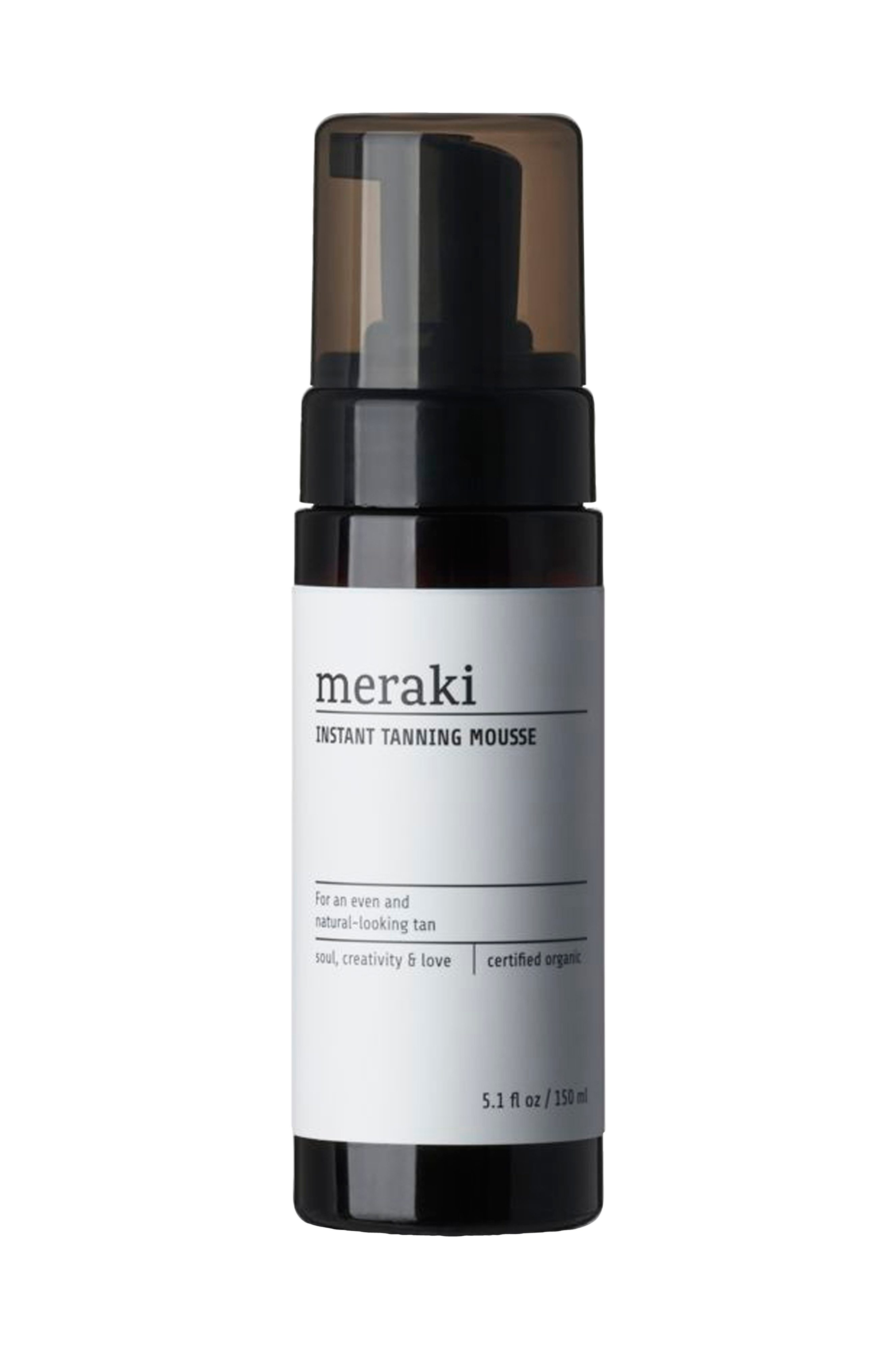 Meraki giver dig en Instant Tanning Mousse, der giver en jævn og naturlig kulør. Den er certificeret økologisk og har en naturlig farve fra karamel. Ved påføring efterlader den en direkte solbrun farve, der udvikler sig fuldt ud på bare 2-6 timer og efterlader din hud fugtet takket være glycerin og aloe vera. Prioriter at eksfoliere din hud og fugte særligt tørre områder, før du påfører moussen, for at få det bedste resultat. Fordeles jævnt på huden og i ansigtet med Merakis selvbrunerhandske for en jævn solbrun farve. Farven falmer gradvist i løbet af et par dage; påfør igen efter behov for at vedligeholde din kulør. Produktet er fremstillet i Danmark.