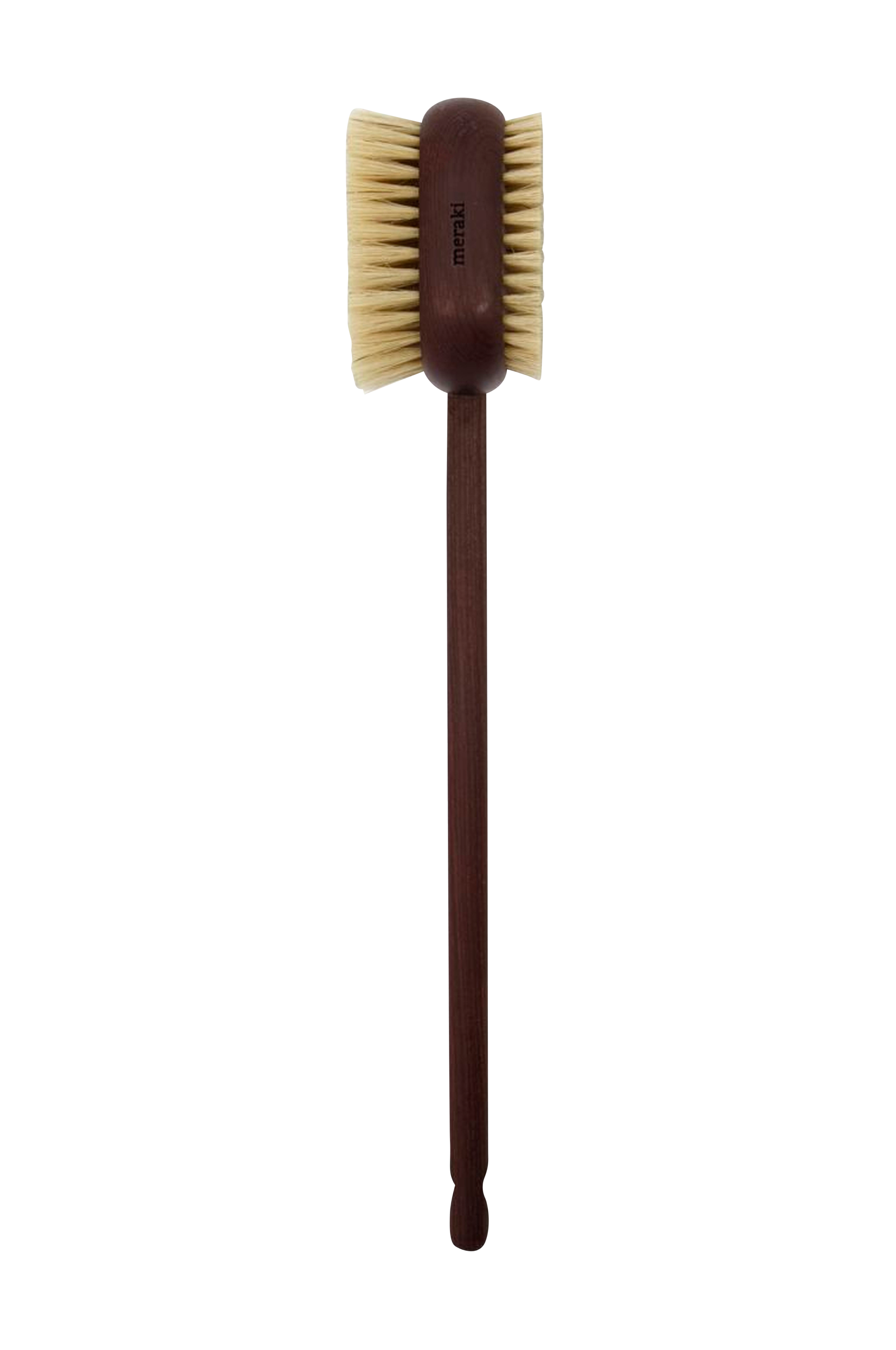 Få en mild men effektiv peeling med denne kropsbørste. I bruseren bruger du børsten til at skrubbe, massere og rengøre din hud. Når du gør det regelmæssigt øges blodomløbet og blodcirkulationen forbedres. Meraki har designet den med et langt håndtag, så du også kan nå de steder på ryggen der er svære at nå. Børsten er en 2-i-1-løsning med lange, bløde strå på den ene side og korte, lidt mere stive strå på den anden side. Takket være en varmebehandling er asketræet meget holdbart og tåler fugtigheden i brusebadet.