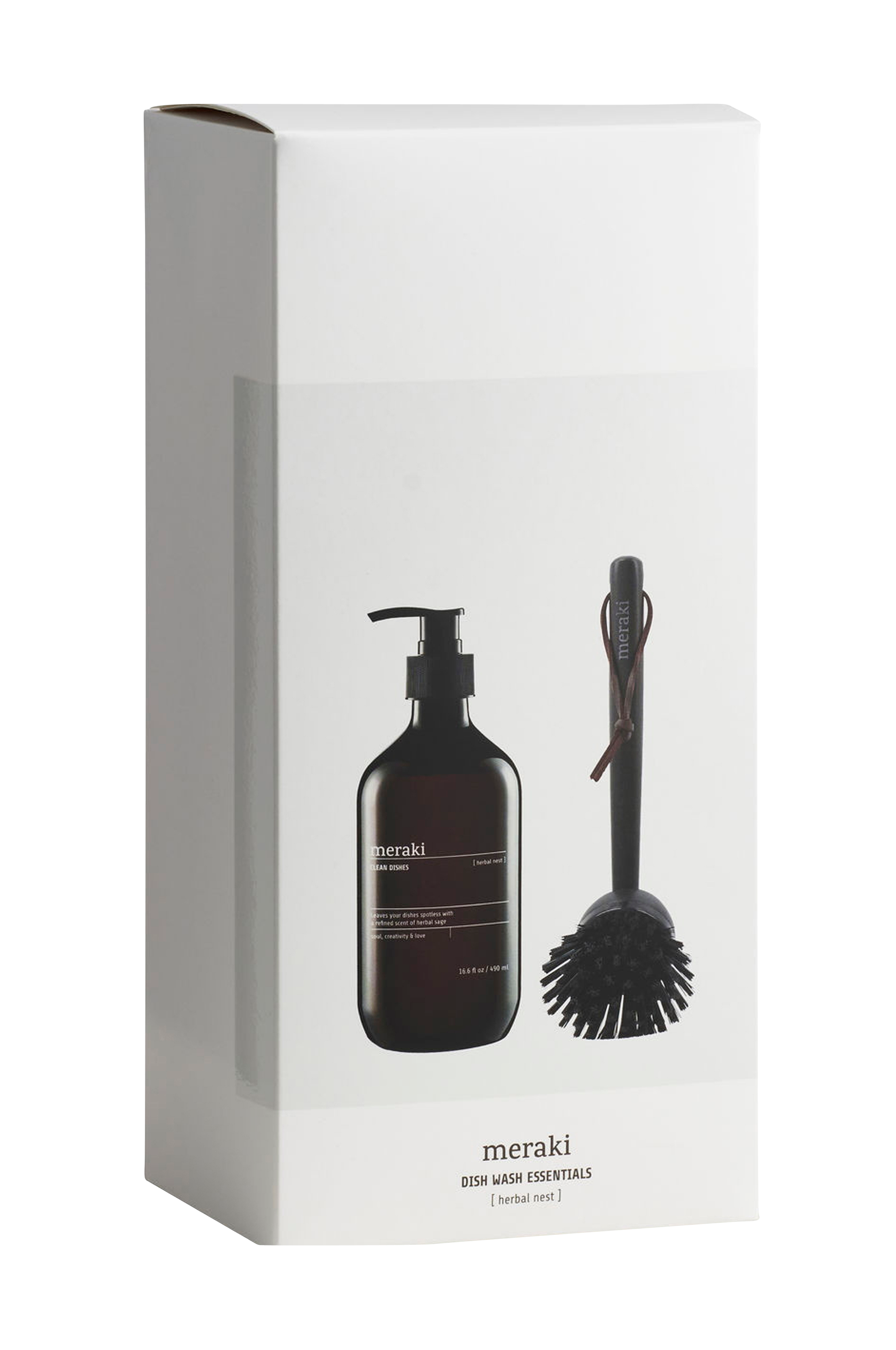 Overrask en, du holder af, med en betænksom gave. Denne gaveæske fra Meraki består af vigtige ting til dit køkken. En opvaskesæbe og en opvaskebørste i træ. Kogesæben hedder Herbal Nest og er Svanemærket. Den har en let urteagtig duft med noter af salvie, citrus og moskus. Opvaskebørsten er lavet af bambus og har fået en sort bejdse, som lader træets årer skinne igennem. Håndtaget giver dig et behageligt greb, mens selve børsten kan udskiftes for at forlænge opvaskebørstens levetid. Denne gaveæske er kunsten at give en nem gave.