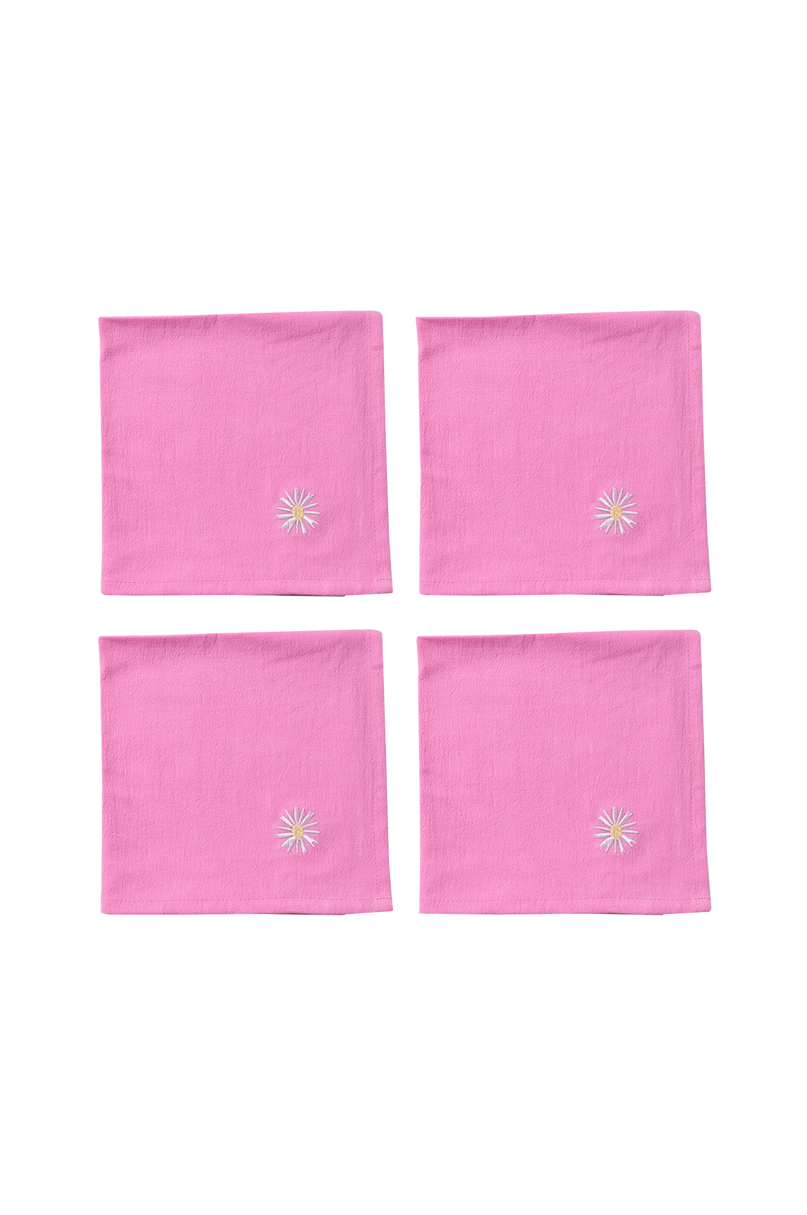 Disse servietter kommer i et sæt med fire. På hver serviet er der broderet en hvid marguerit. Stoffets farve er lyserød, og størrelsen er 40×40 cm. Servietterne er GOTS-certificerede og fremstillet af 100 % økologisk bomuld. Vaskes ved maks. 60 grader.
