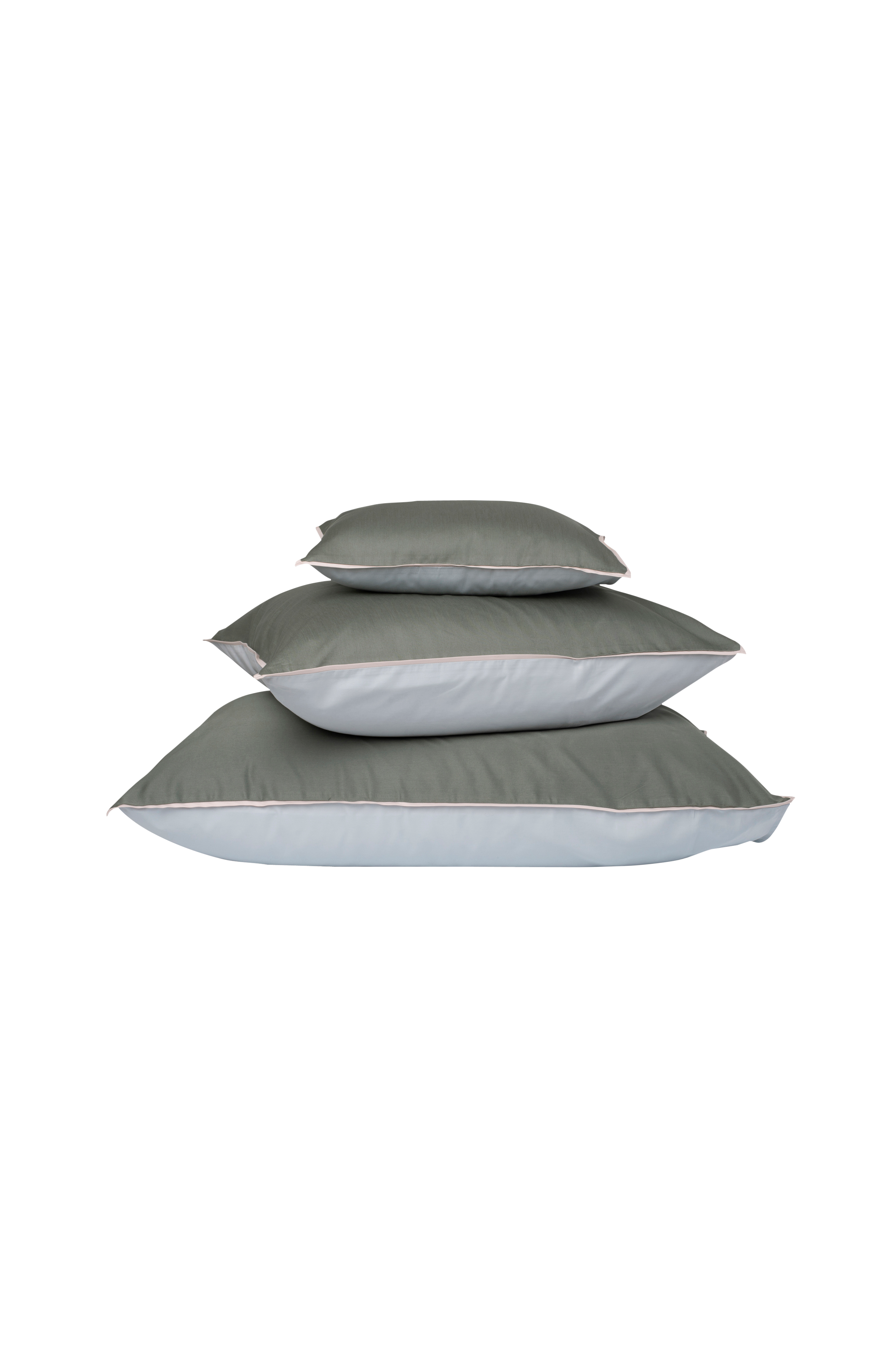 Tofarvede pudebetræk i silkeglat kæmmet bomuldssatin. Trådtæthed: 340 tc. Pudebetrækket er designet med forskellige farver på forside og bagside og rammes ind af en 3 mm mørkegrå flat piping. Pudebetrækket er syet uden vinge, og åbningen går helt ud i kanten for får dermed to forsider. Fremstillet i Portugal. Öko-Tex Standard 100. Vaskes i 60 grader, hængetørres. Må ikke tørretumbles. Stryges eller rulles ved middelvarme for at få satinvævningens flotte glans frem. Undgå at køre strygerullen over lynlås