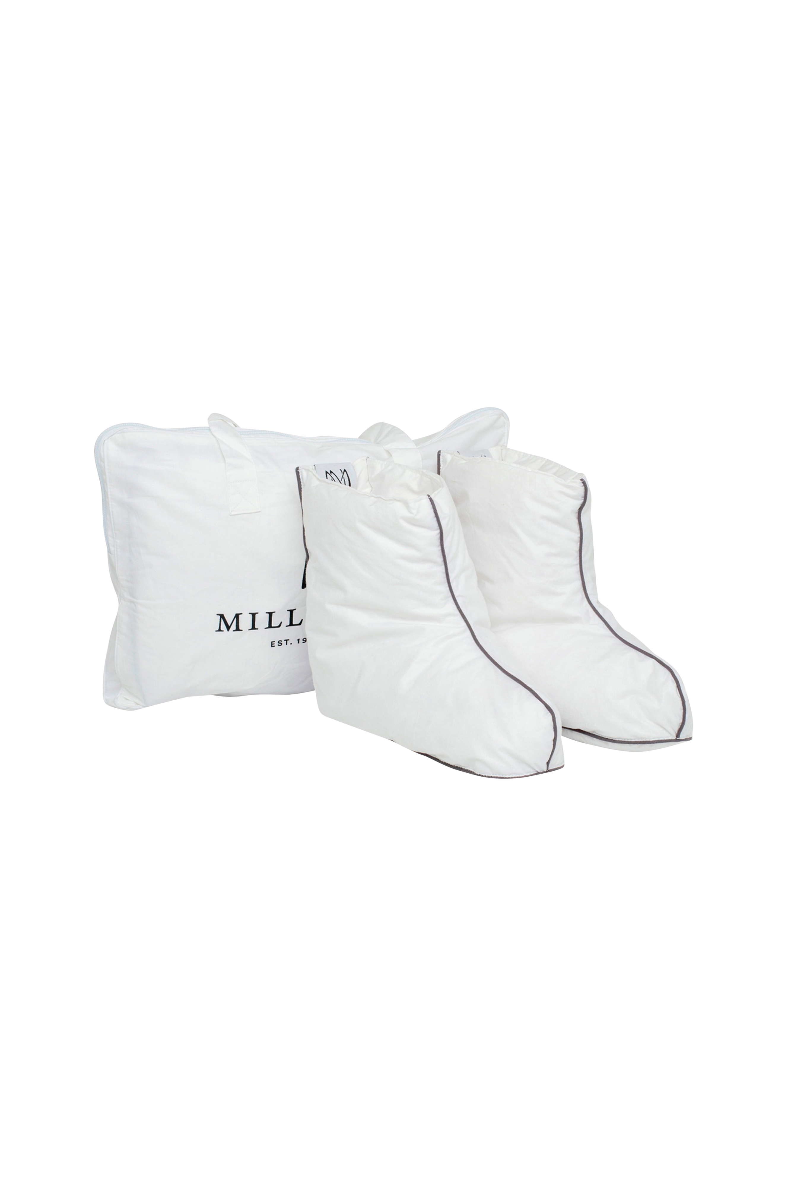 Duntøfler fyldt med europæiske klasse 1-dun, 60 % dun og 40 % fjer. Betræk i blødt bomuldsstof. Stilfuldt design med dekorativ mørkegrå piping og mille notti-monogrammet på den øverste kant af ryggen. Leveres i en bomuldspose med lynlås.