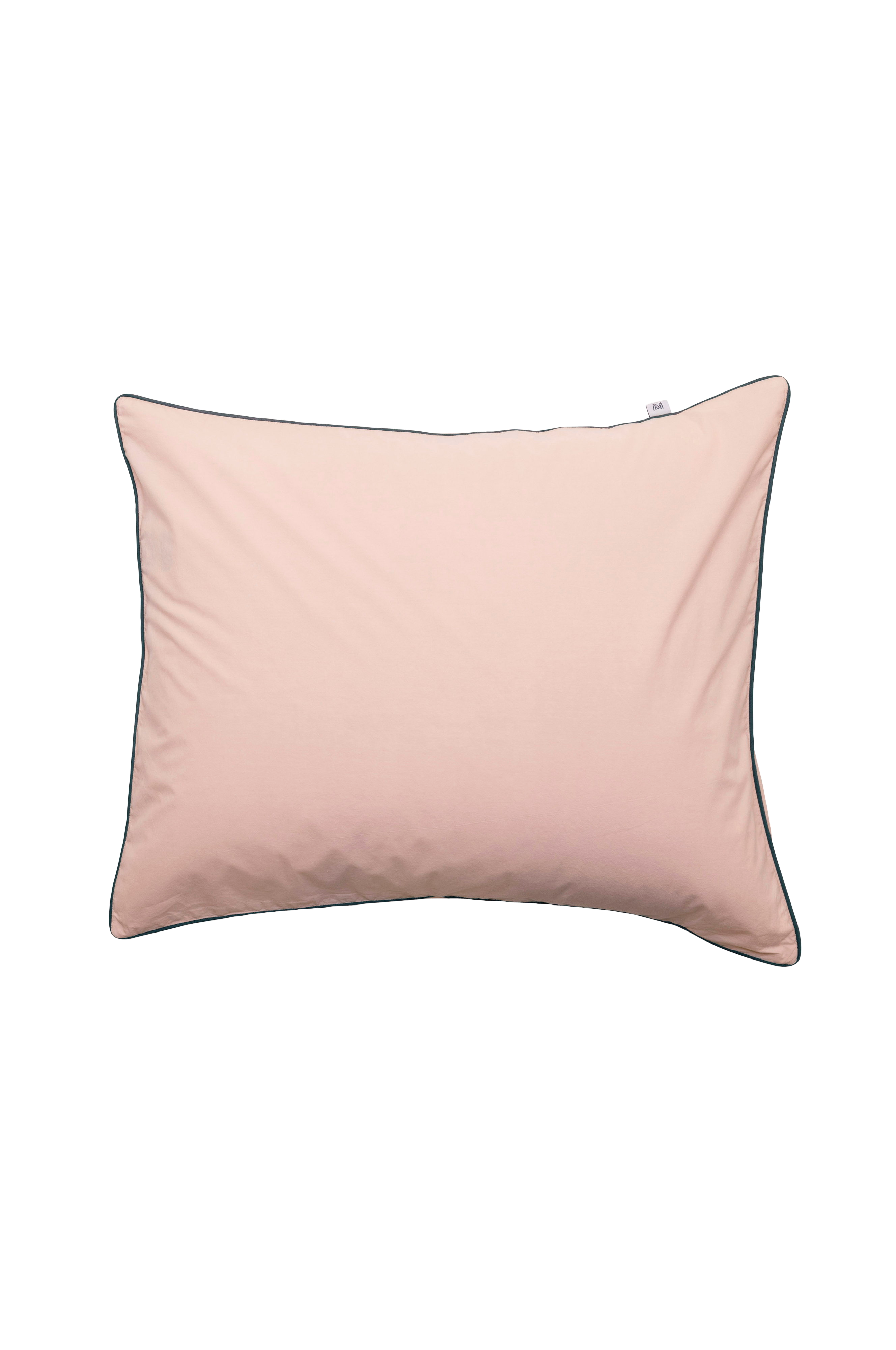 Pudebetræk i sprød percale lavet af økologisk kæmmet bomuld. Trådantal: 230 tc. Ensfarvet rosa, afsluttet med en mørkeblå piping. Lukning med knapper.